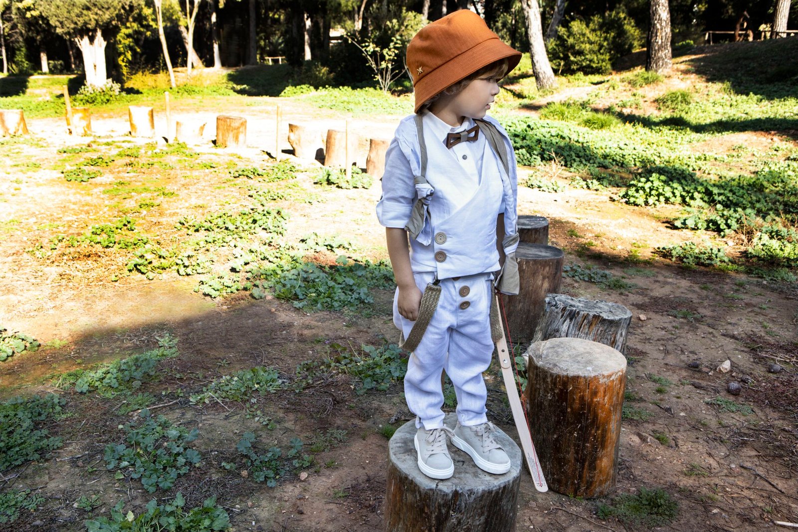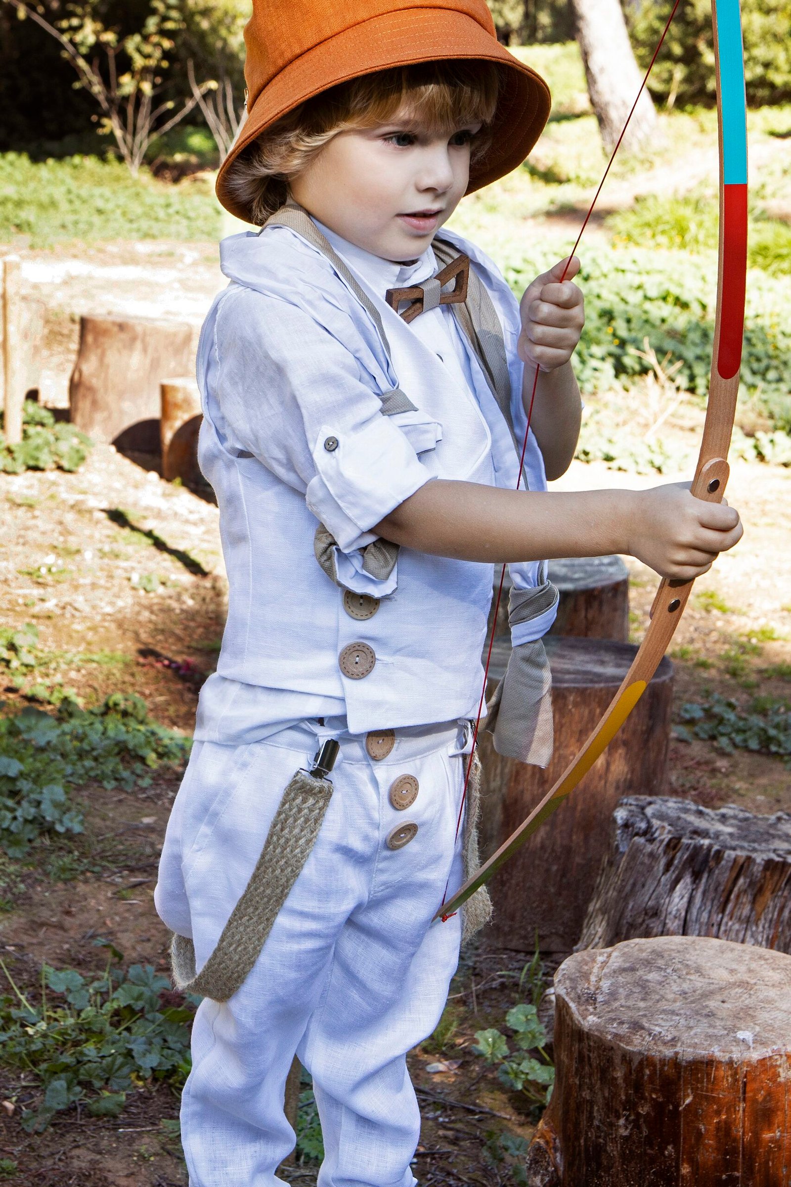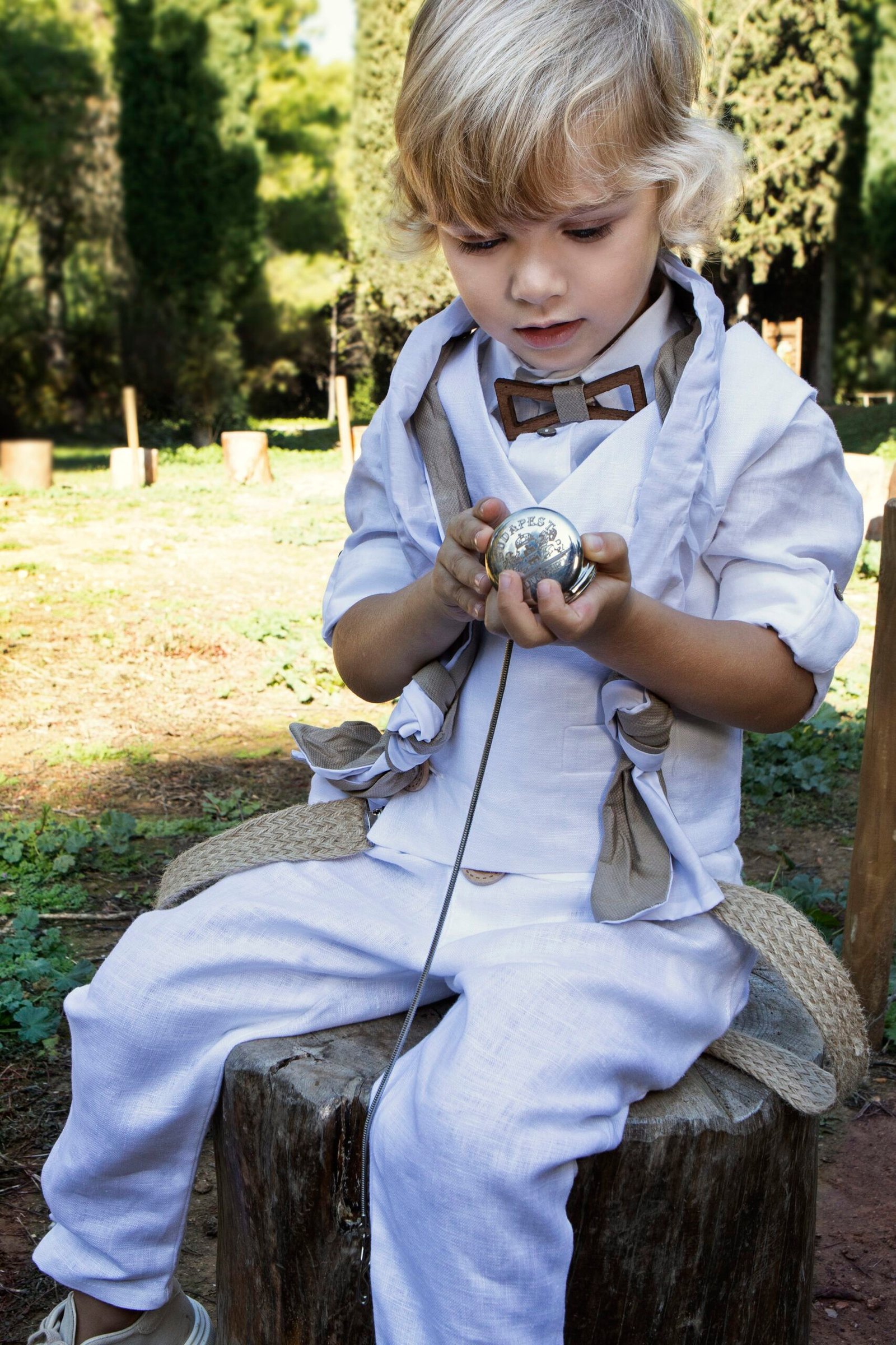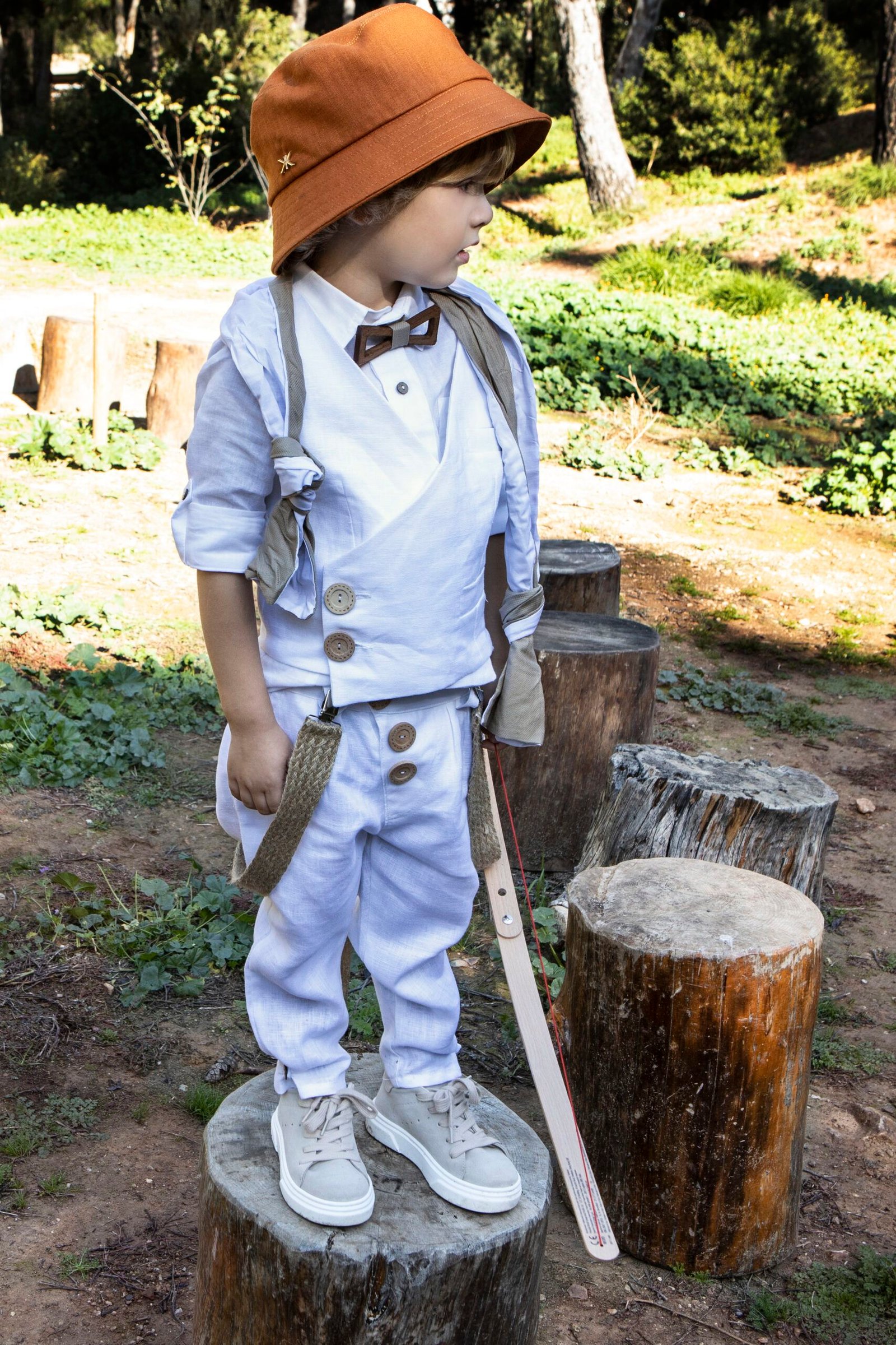 Ένα total white σετ με σπαγγί λεπτομέρειες γιλέκο με πλάγιο κούμπωμα, λευκό λινό πουκάμισο και παντελόνι με πιέτες και λοξό κούμπωμα, δίχρωμο φουλάρι λευκό σπαγγί, τίράντες, ξύλινο παπιγιόν ,καπέλο ψάθινο ή μπερές .