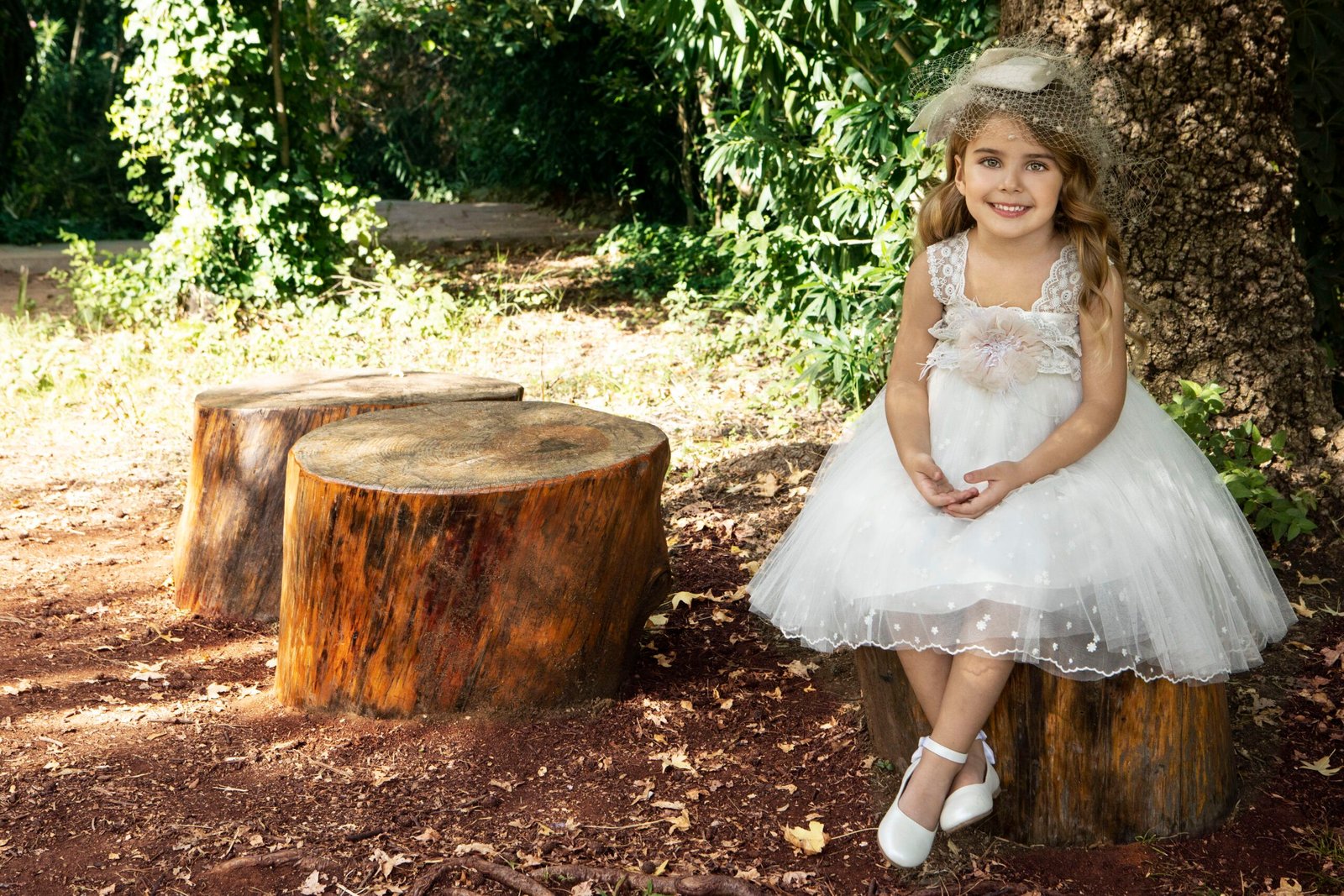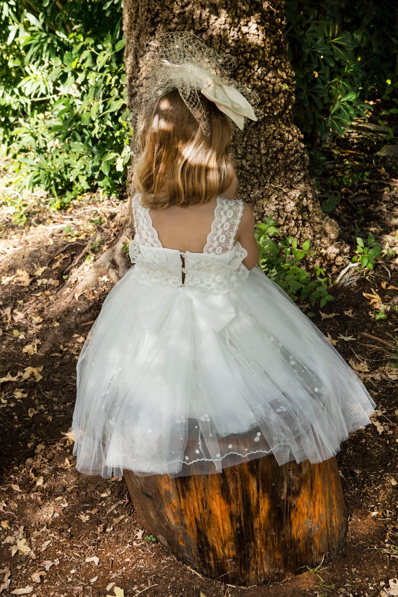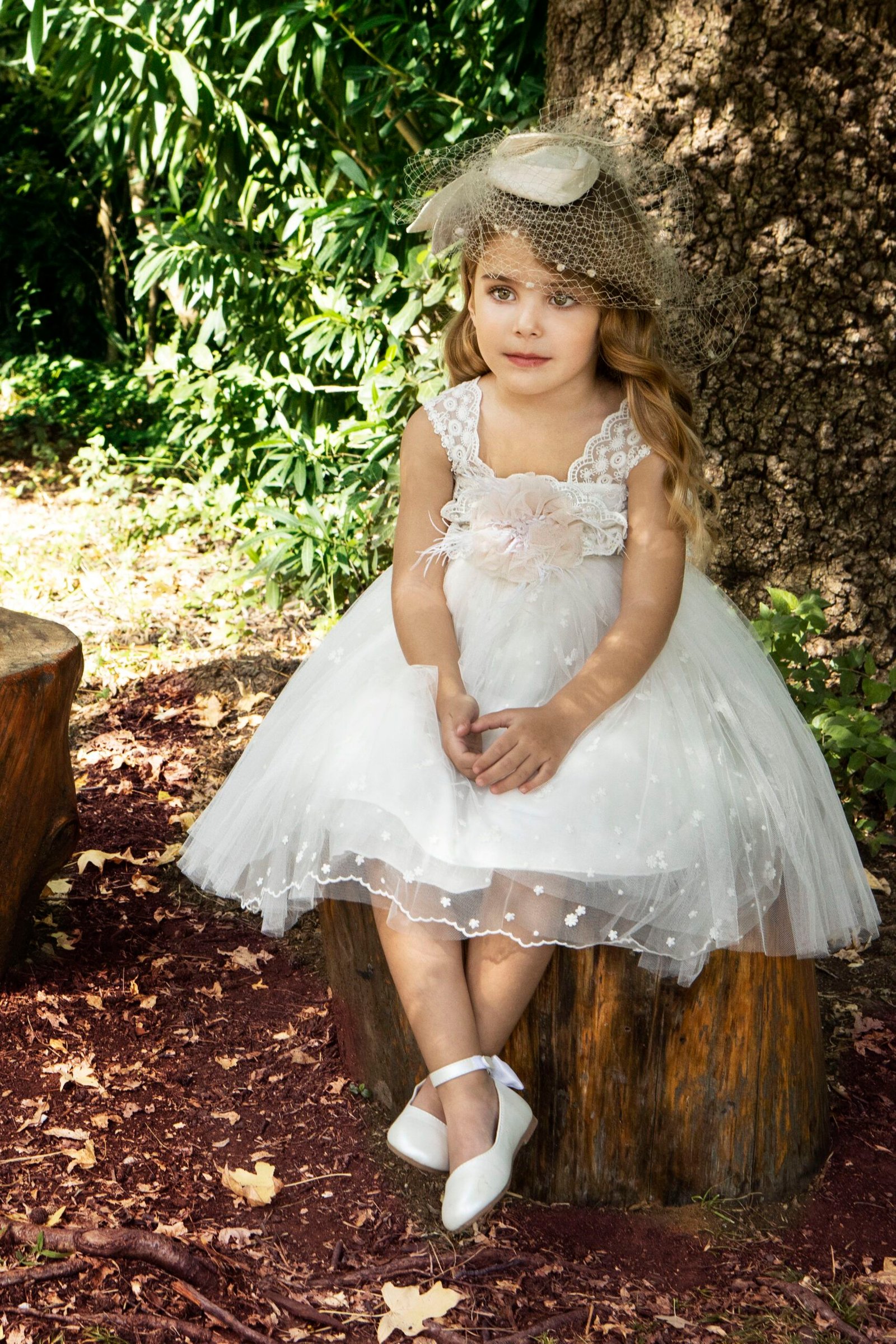 Ρομαντικό φόρεμα βάπτισης σε λευκή απόχρωση με ιδιαίτερη ανάγλυφη δανδέλα και χειροποίητο λουλούδι που στολίζει τη μέση του φορέματος . τούλινη φούστα με κεντημένα λουλουδάκια και εσωτερική επένδυση από μαλακό βαμβακερό ύφασμα . Ασορτί κορδέλα με το ίδιο λουλούδι του φορέματος και κατ’ επιλογή μπαντάνα ή τουρμπάνι .