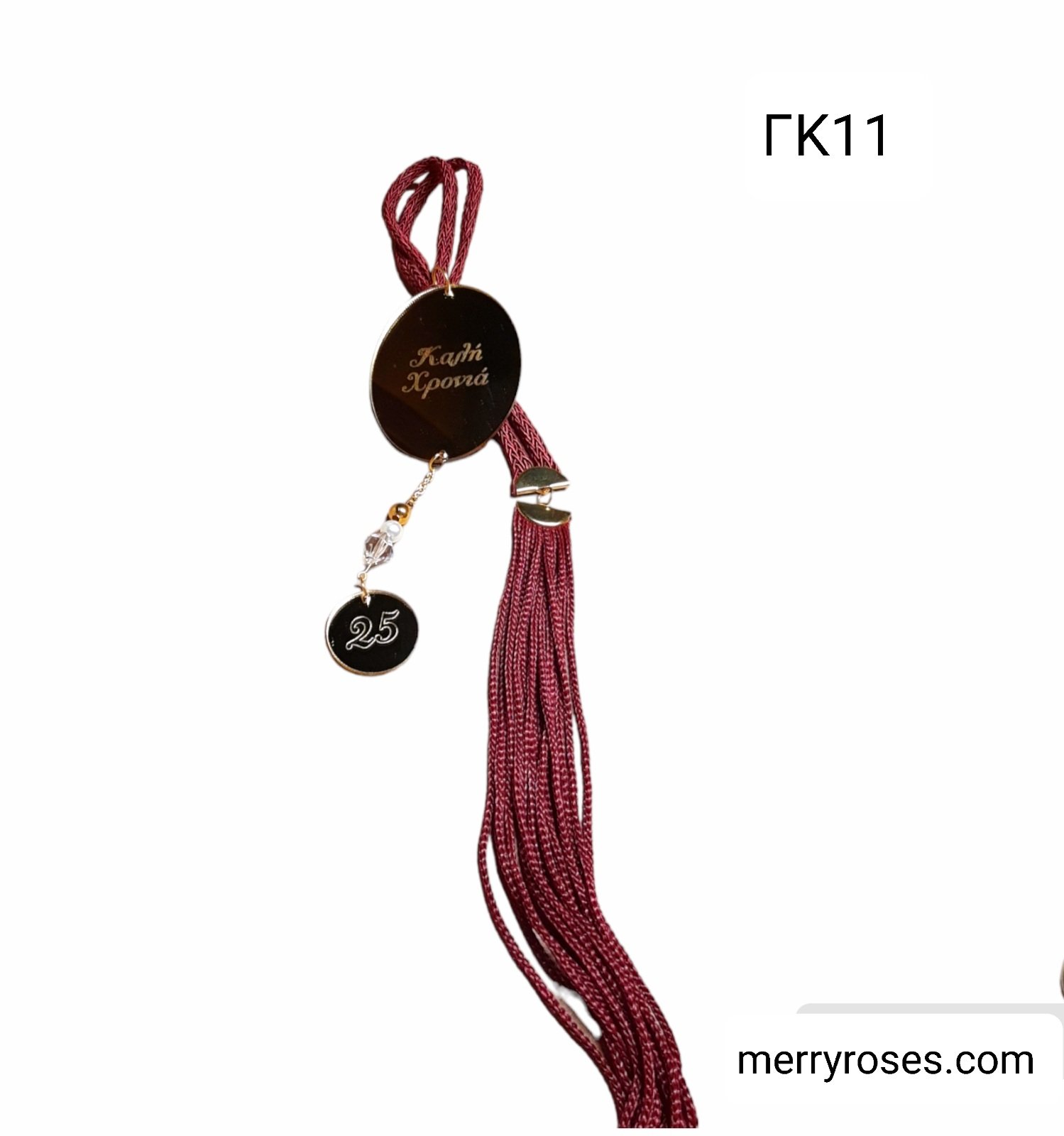 Κρεμαστό γούρι καλή χρονιά (χρυσό plexi),με φούντα μπορντώ και κόσμημα.