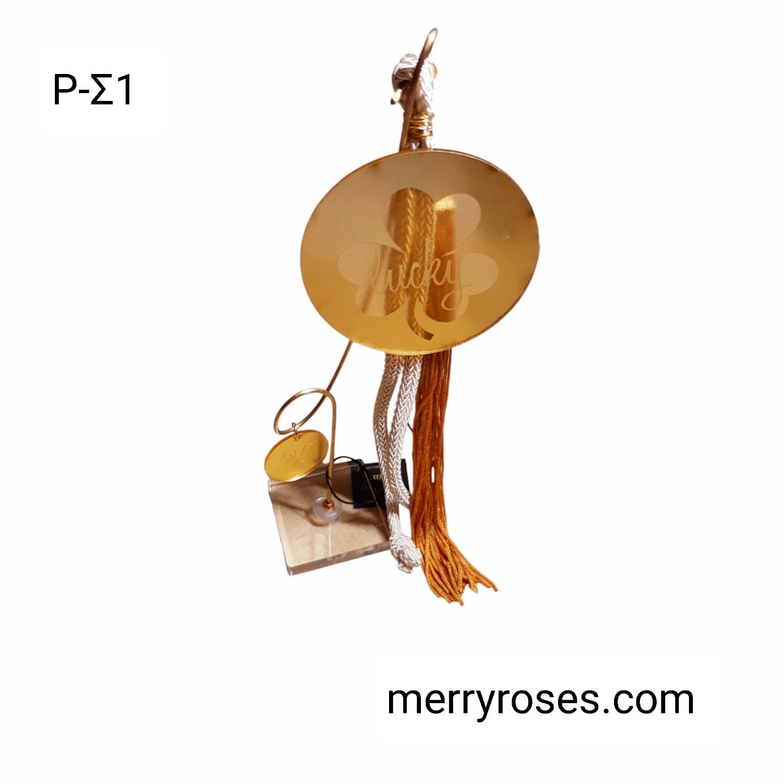 Γούρι χρυσό plexi τριφύλλι 2025 σε βάση μαζί με μέταλλο μπρούντζου.