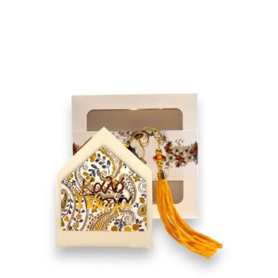 Διακόσμηση: Πορτοκαλί φούντα, χρυσά διακοσμητικά στοιχεία (κρίκοι, χάντρες), πορτοκαλί/κεχριμπαρένια χάντρα