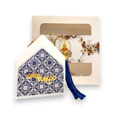 Διακόσμηση: Μπλέ φούντα, χρυσά διακοσμητικά στοιχεία (κρίκοι, χάντρες), πορτοκαλί/κεχριμπαρένια χάντρα