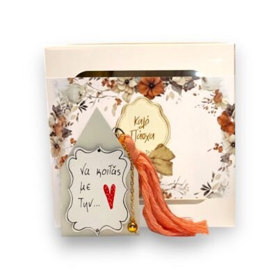 Διακόσμηση: Κοραλί/ροζ φούντα, χρυσή αλυσίδα με χάντρα και κουδουνάκι