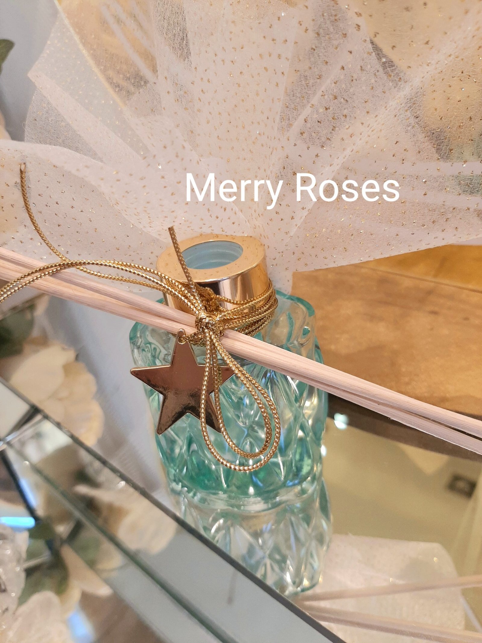 Μπομπονιέρα βάπτισης αρωμα diffuser βανίλιας με στικς και χρυσό μεταλλικό αστέρι.
