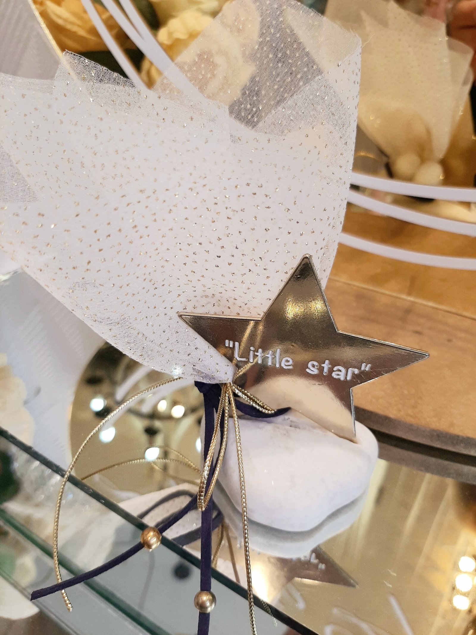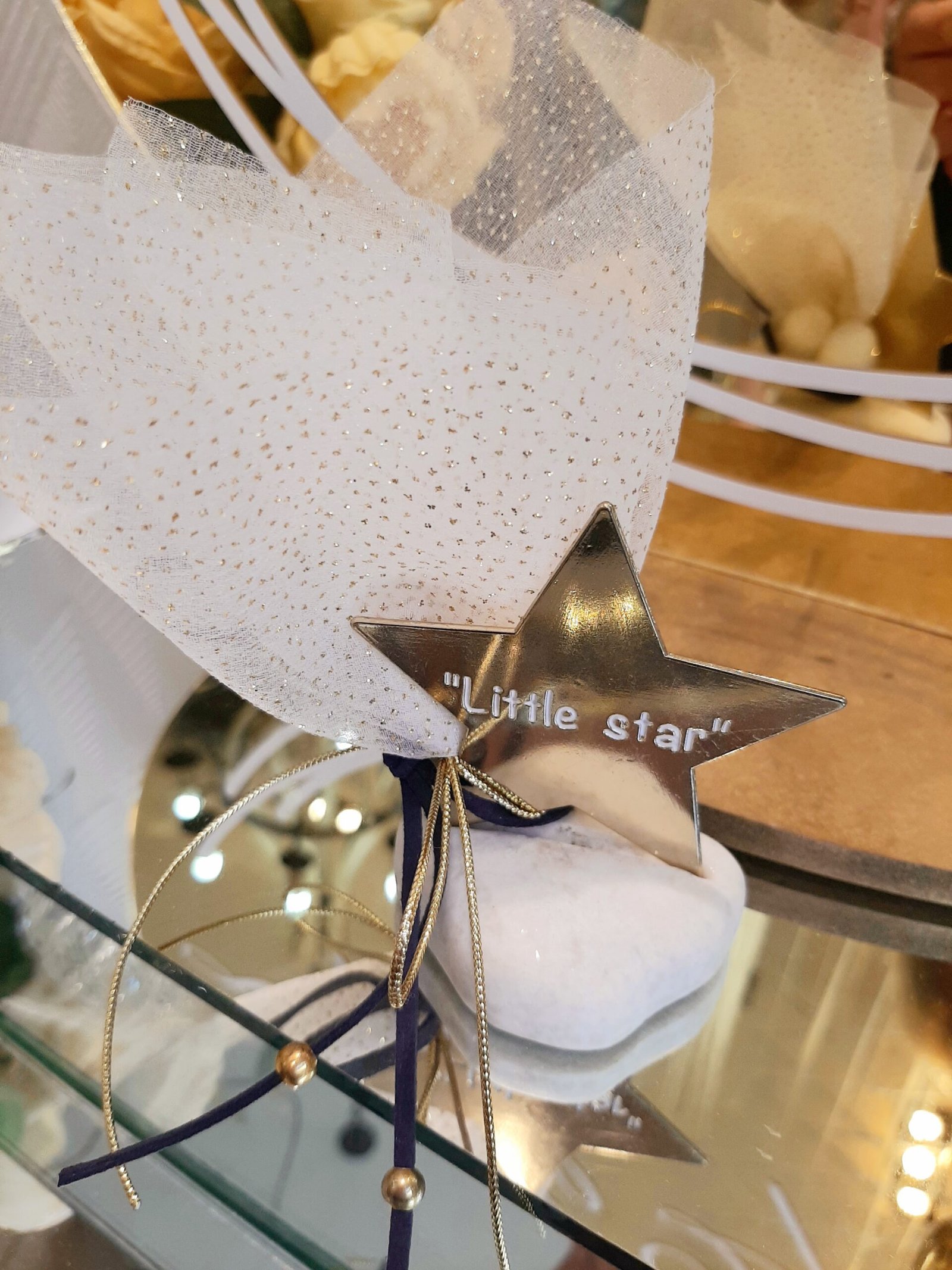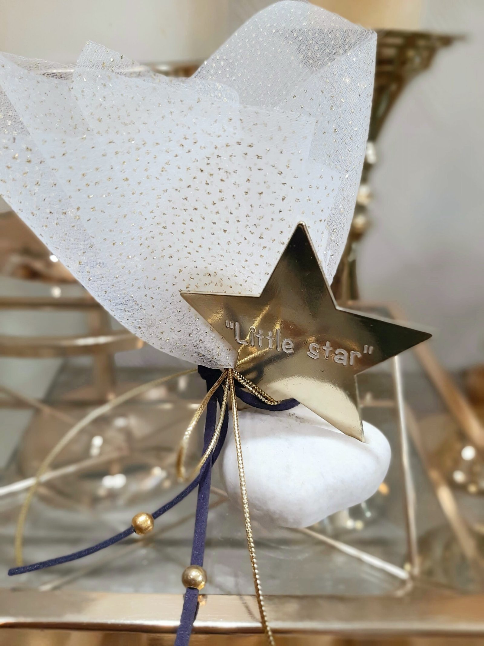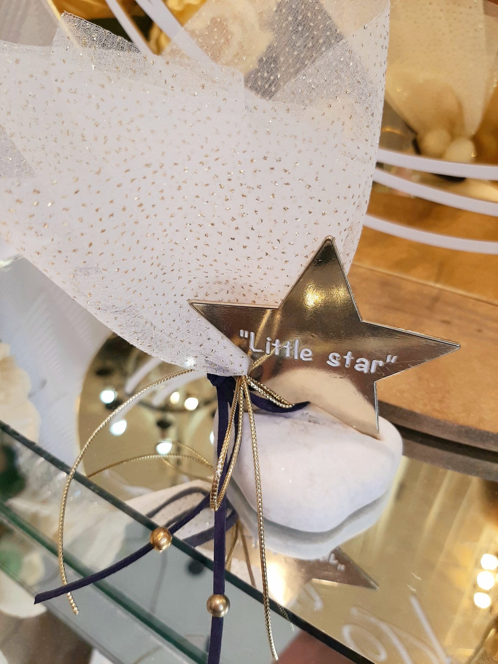 Μπομπονιέρα βάπτισης αστέρι μεταλλικό χρυσό my little star, πάνω σε πέτρα ,με δερμάτινο κορδόνι και χρυσές πέτρες.
