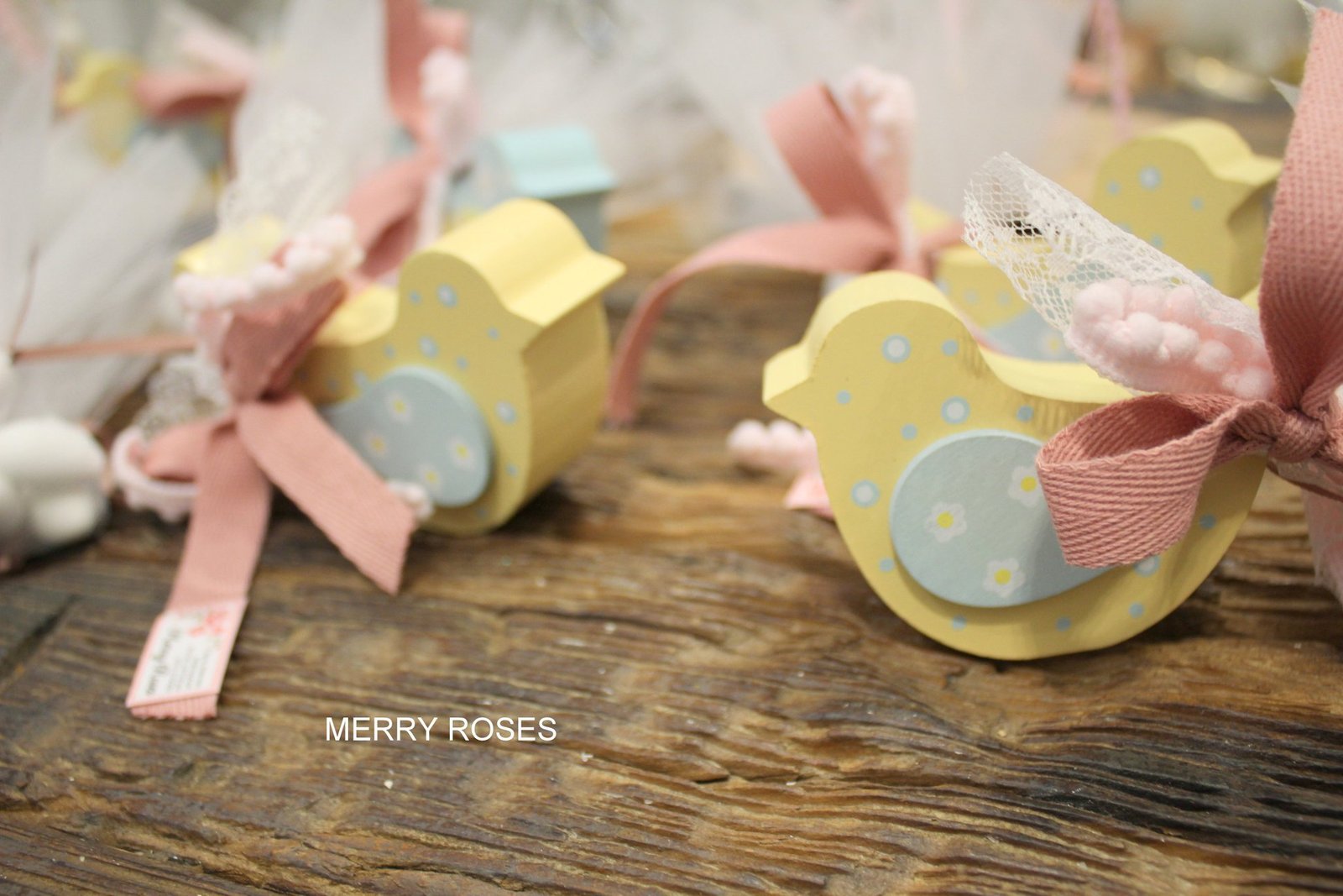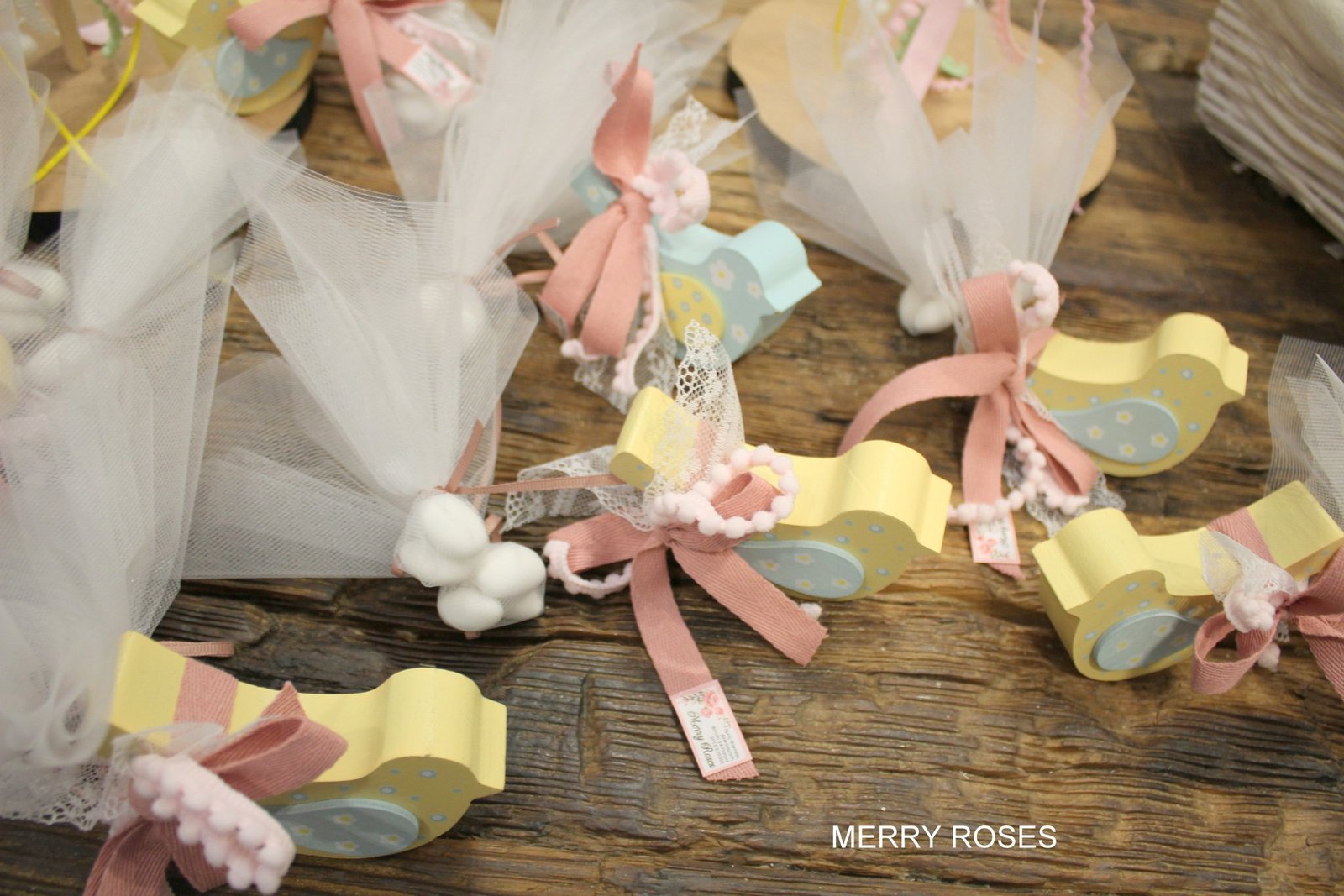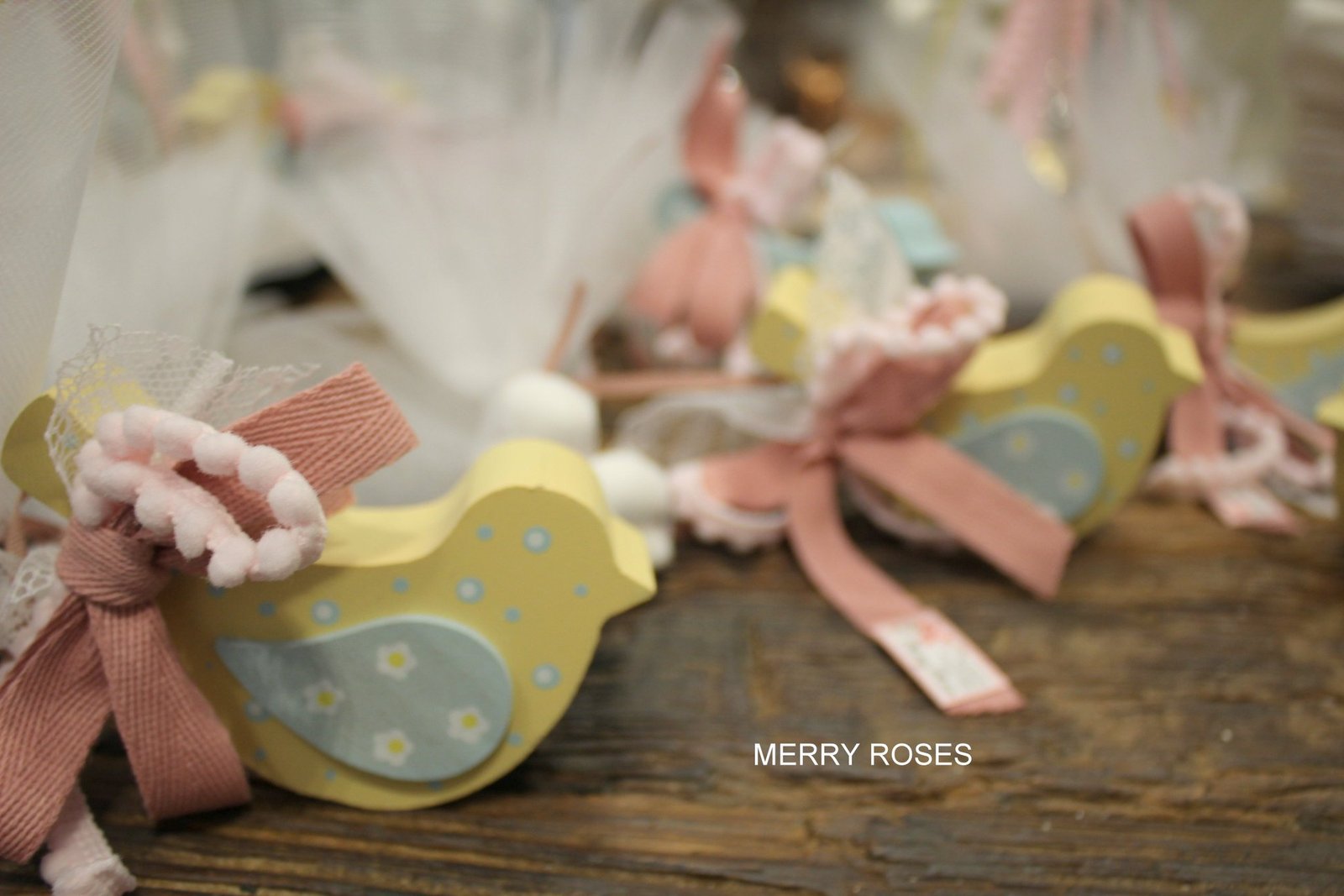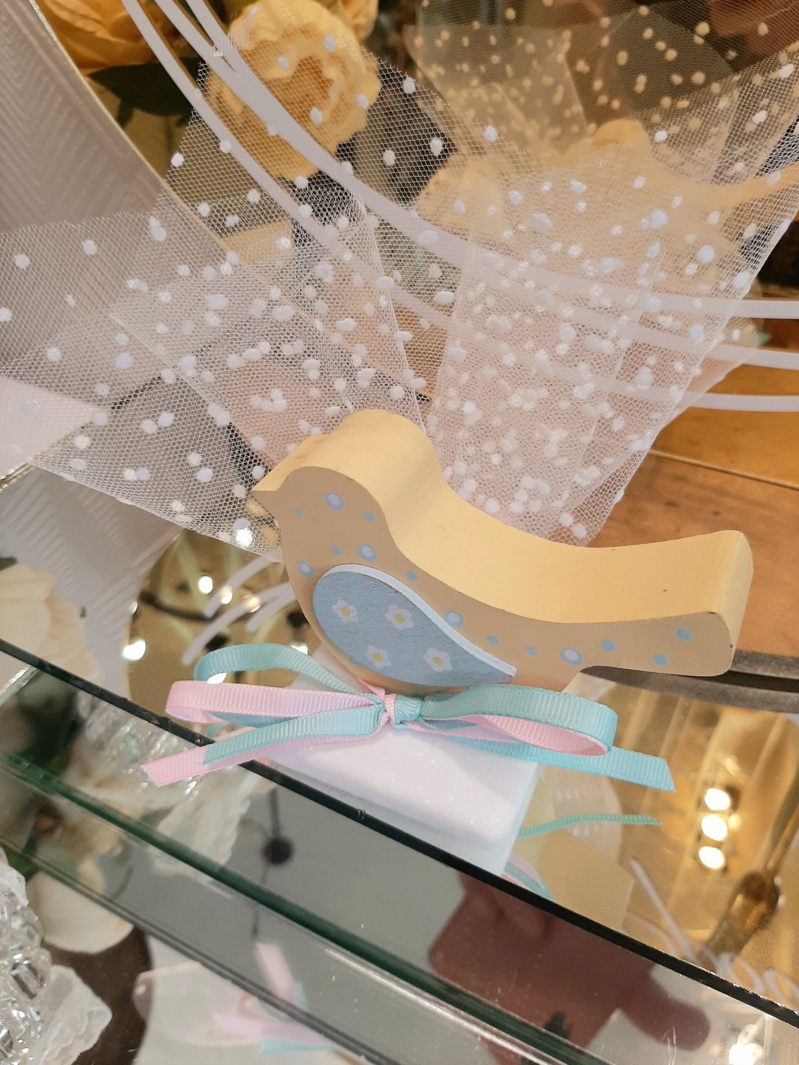 Μπομπονιέρα Βάπτισης Πουλάκι ξύλινο κίτρινο-βεραμάν,με πουά τούλι και ροζ,βεραμάν κορδέλες.