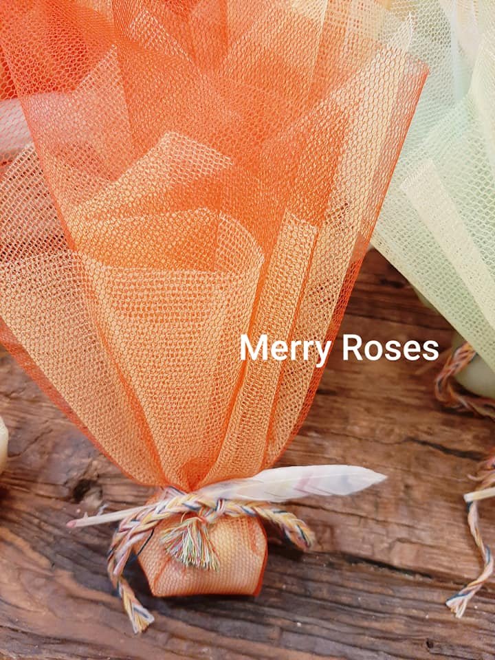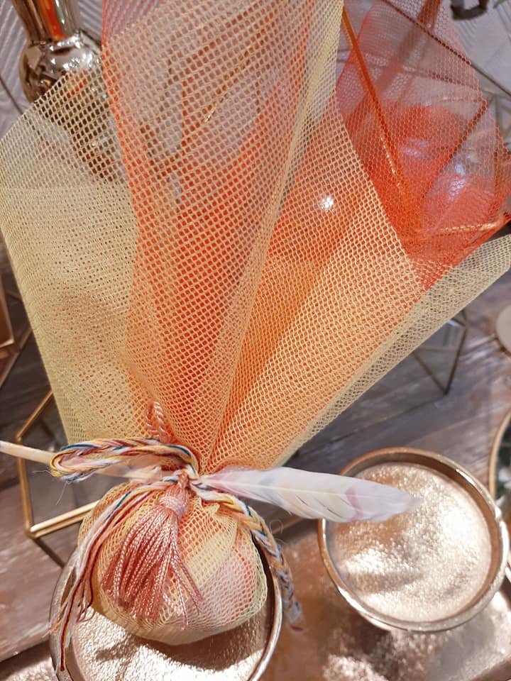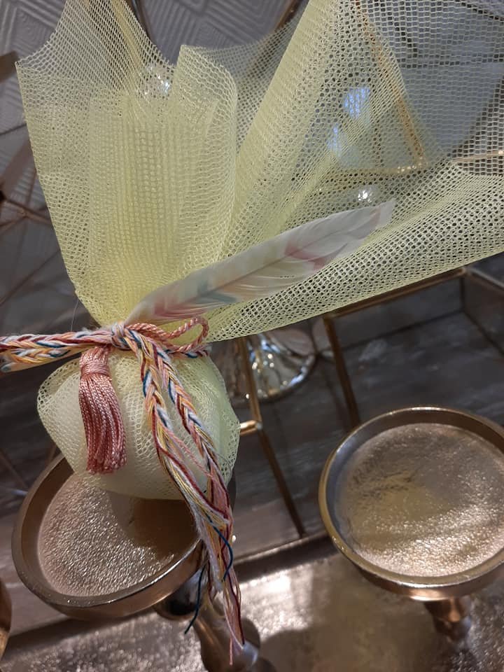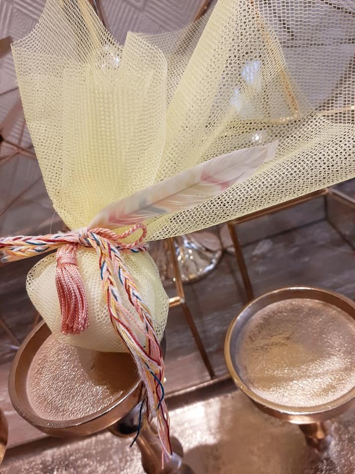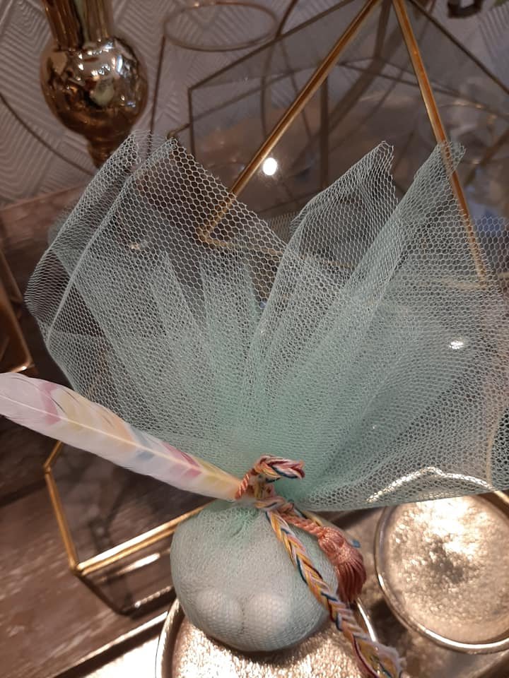 Μπομπονιέρα βάπτισης με ινδιάνικο θέμα, με δίχτυ τούλι σε διάφορα χρώματα ,δεμένη απο χρωματιστό πλεκτό κορδόνι πλεξίδα,φτερό χρωματιστό και μικρή φουντούλα.
