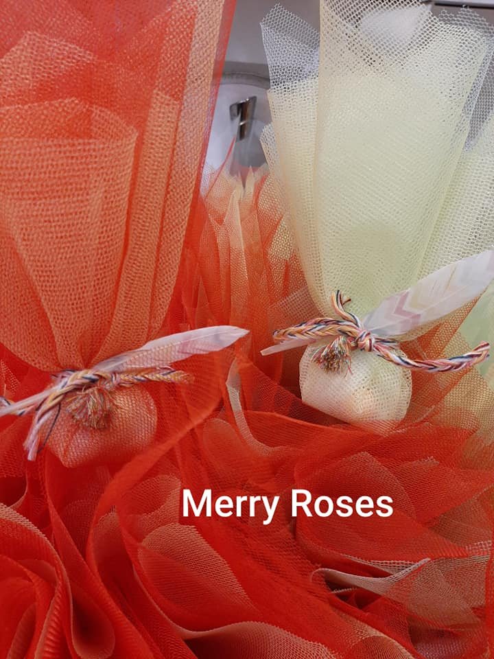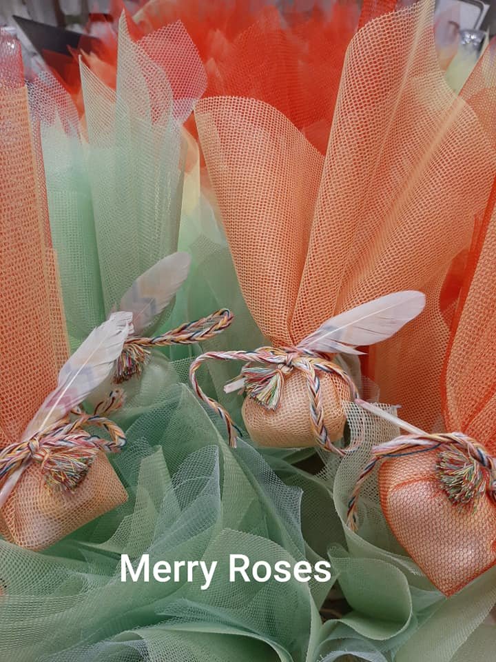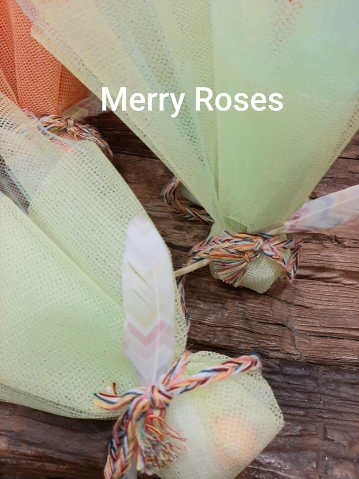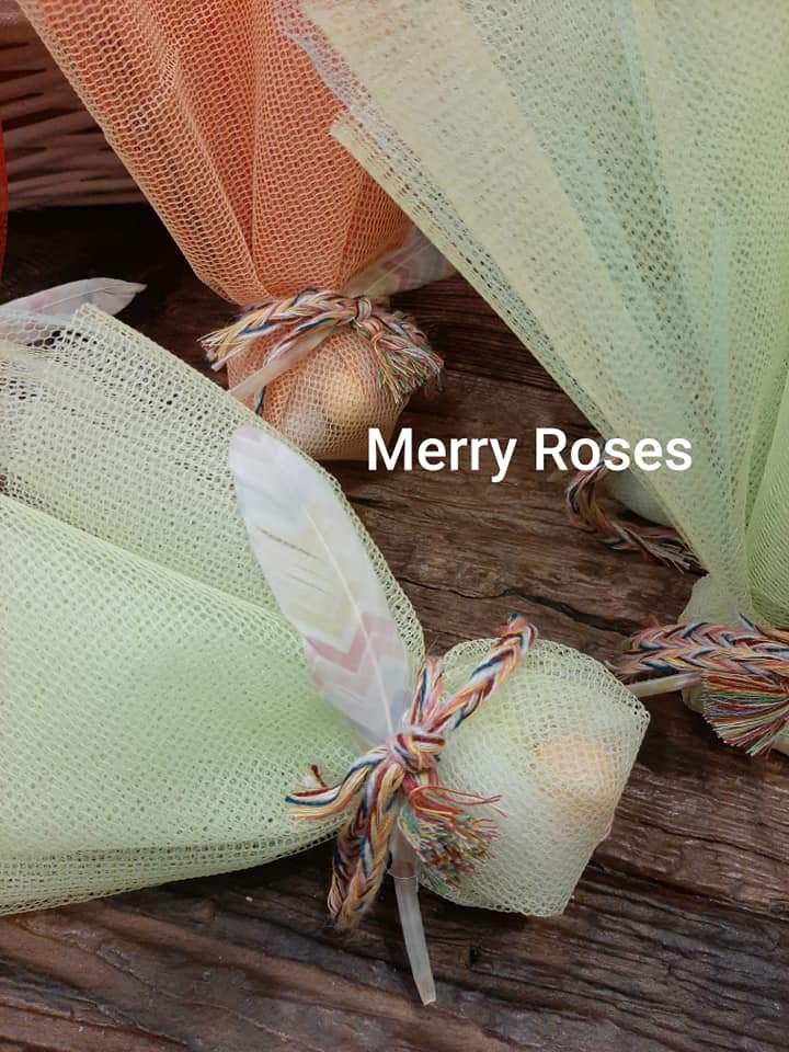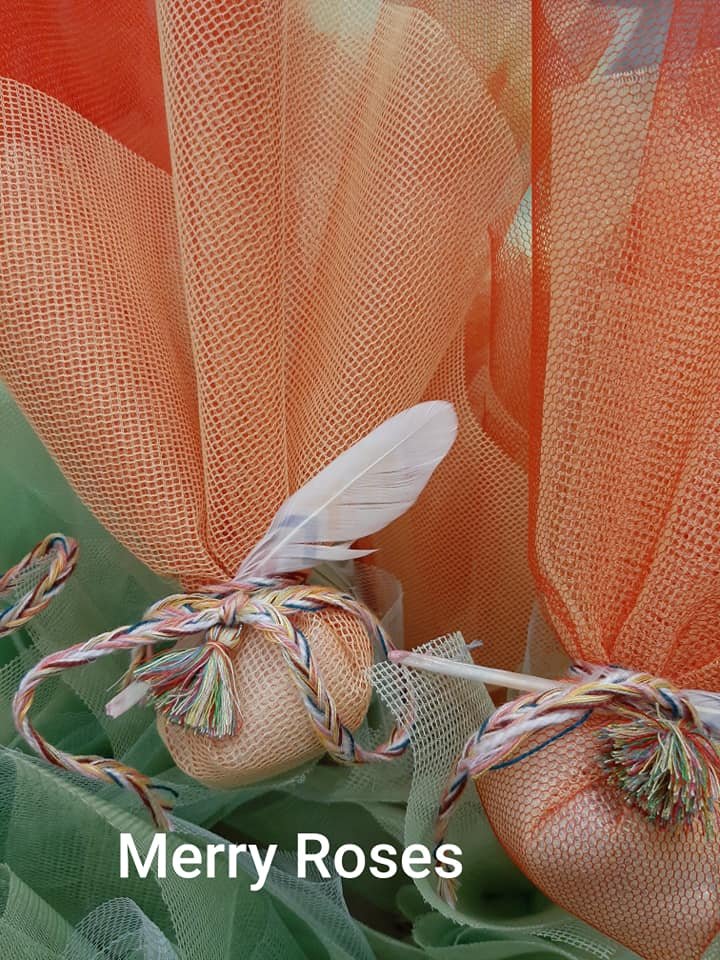 Μπομπονιέρα βάπτισης με ινδιάνικο θέμα, με δίχτυ τούλι σε διάφορα χρώματα ,δεμένη απο χρωματιστό πλεκτό κορδόνι πλεξίδα,φτερό χρωματιστό και μικρή φουντούλα.