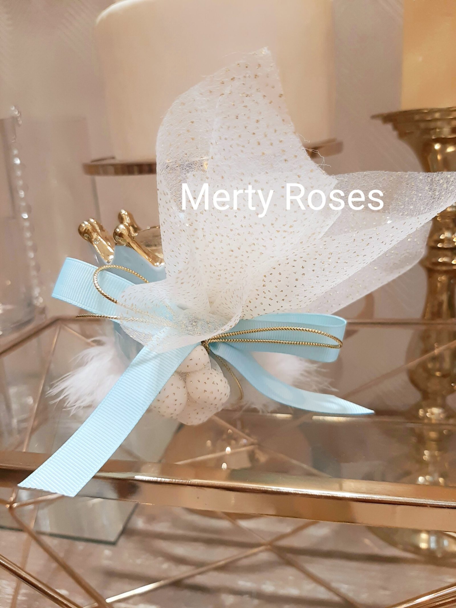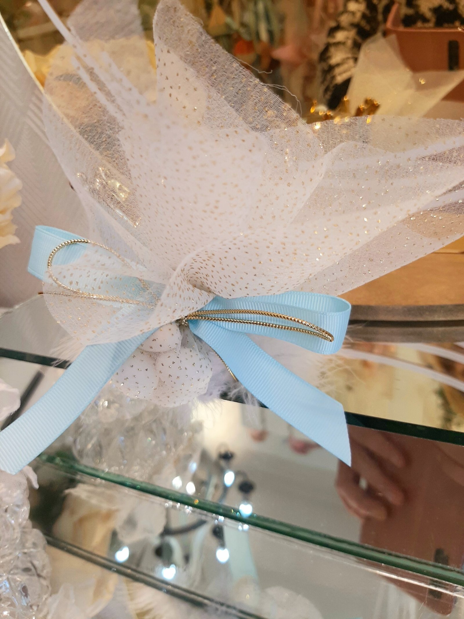 Δεμένη με ιριδίζον γλίτερ τούλι χρυσό, σιέλ γκρό κορδέλα ,χρυσό κορδόνι με χρυσές πέτρες.