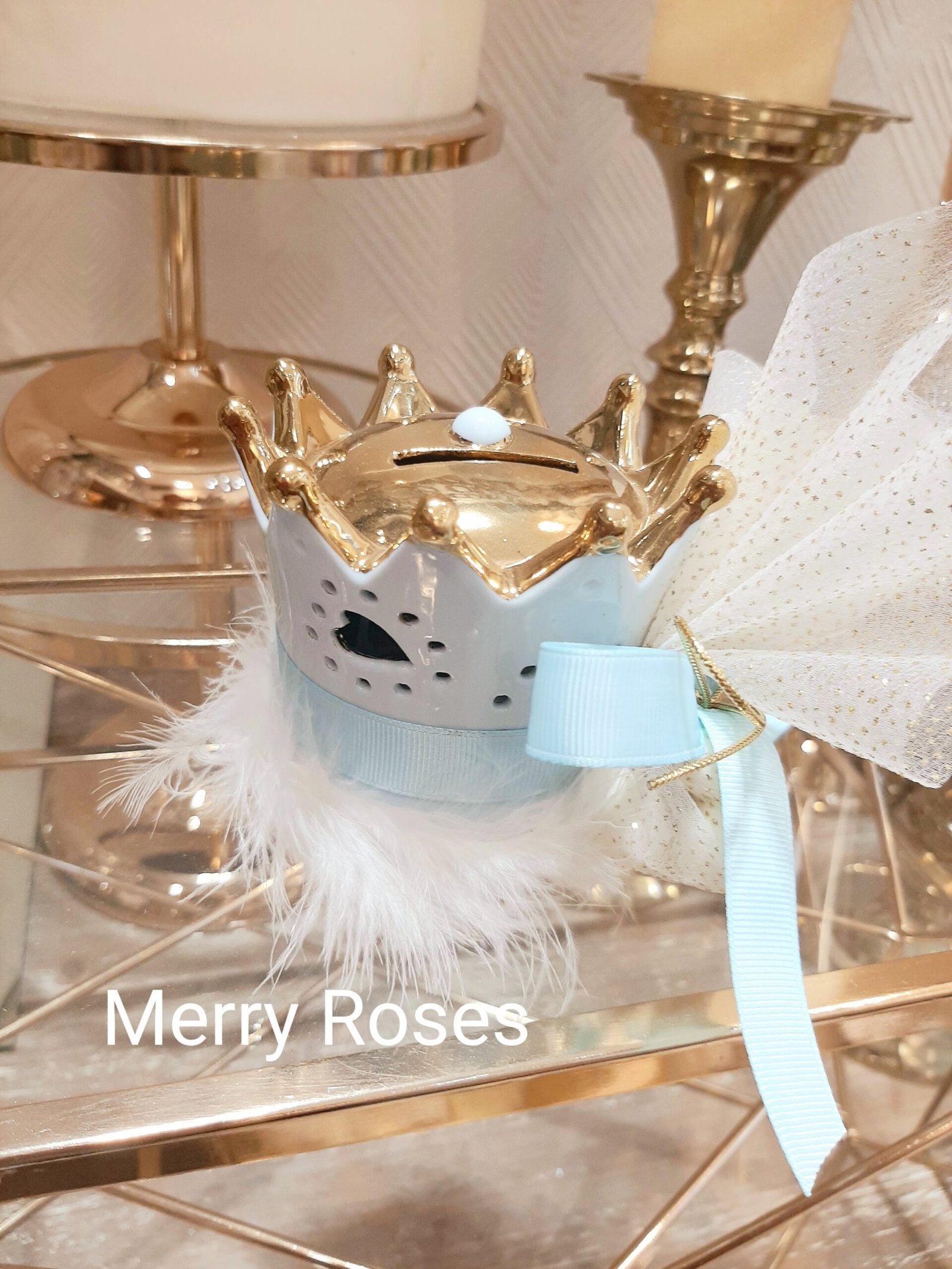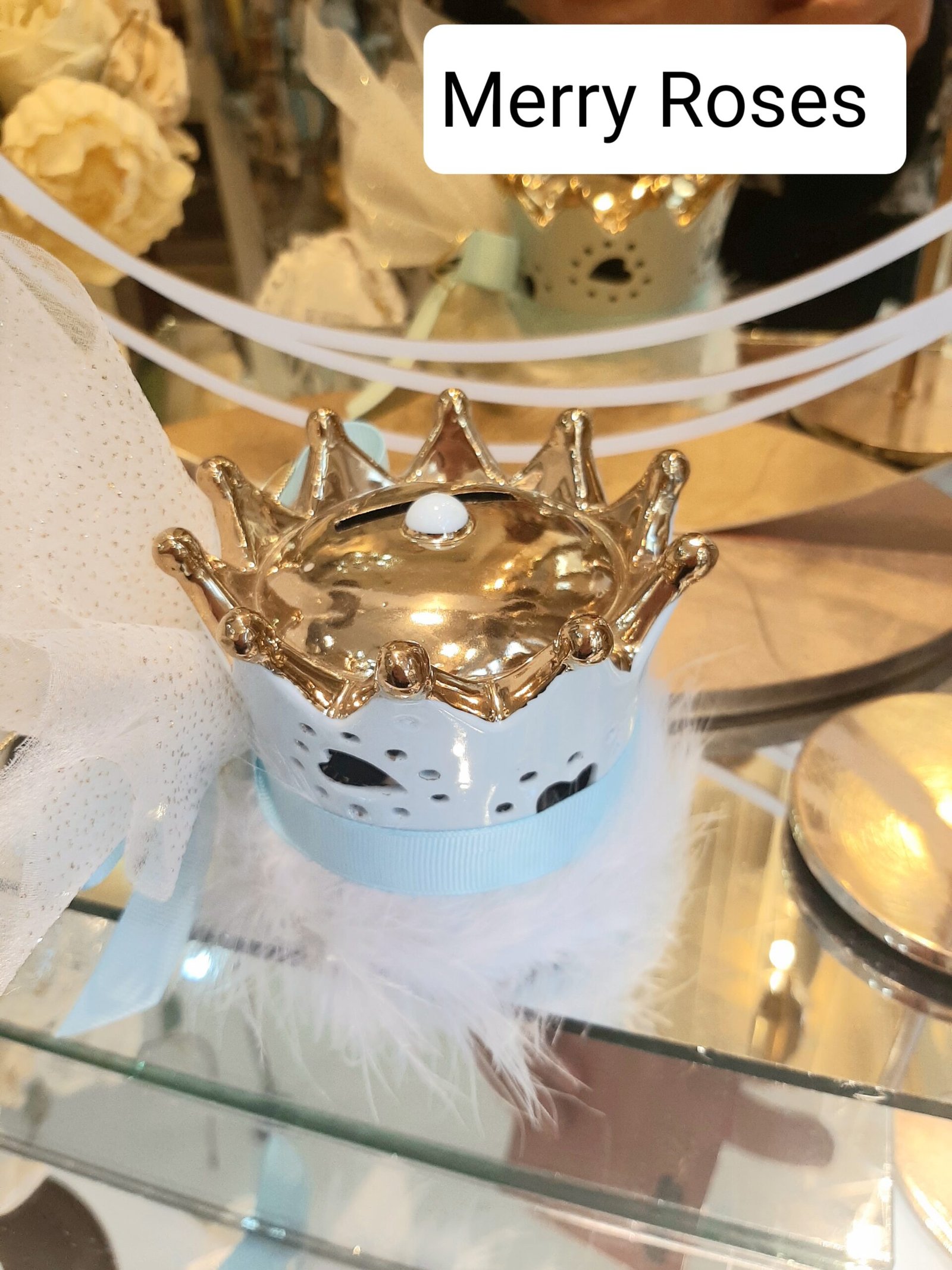 Μπομπονιέρα βάπτισης κορώνα με λευκά πούπουλα