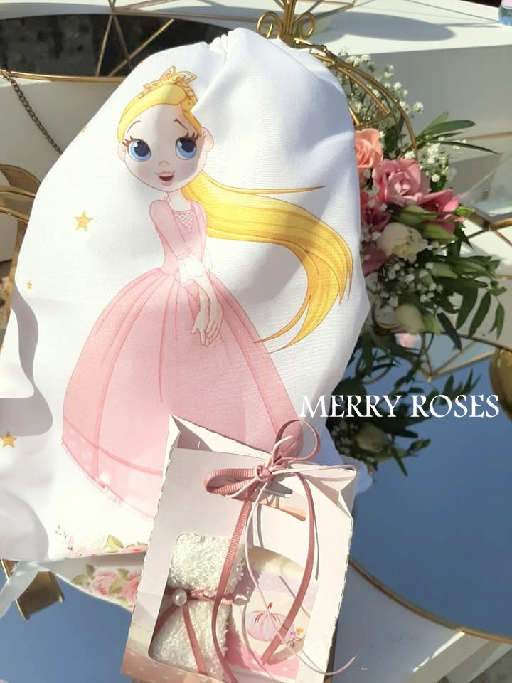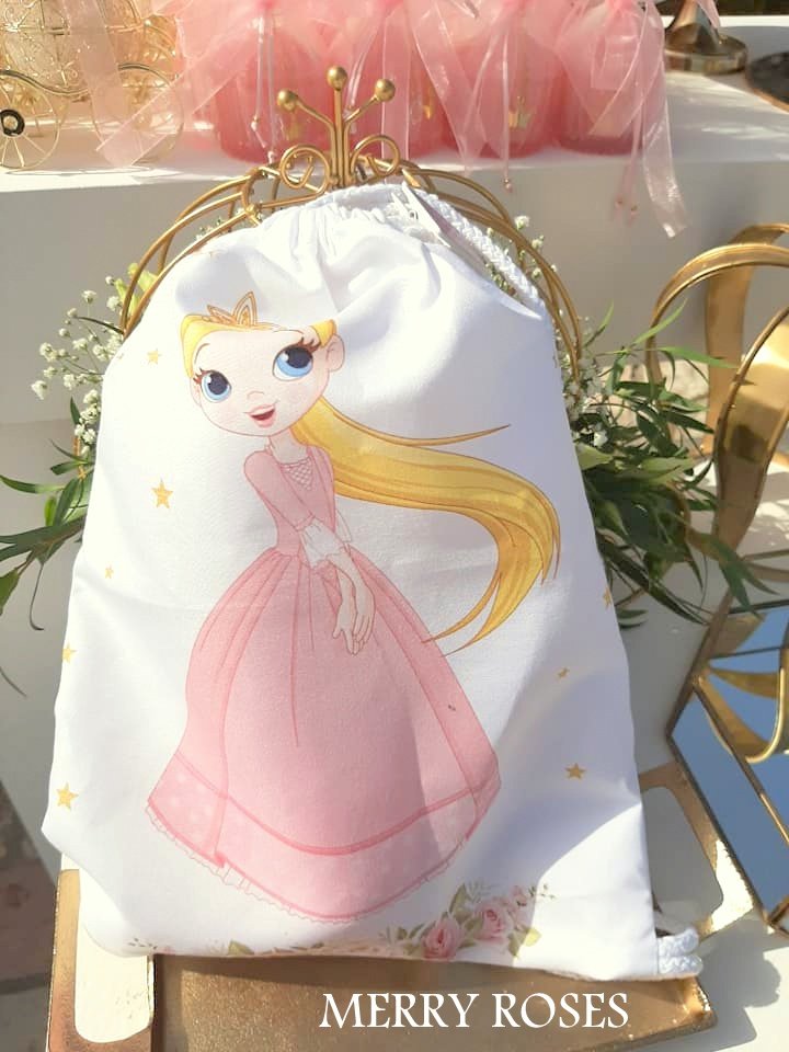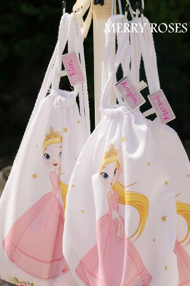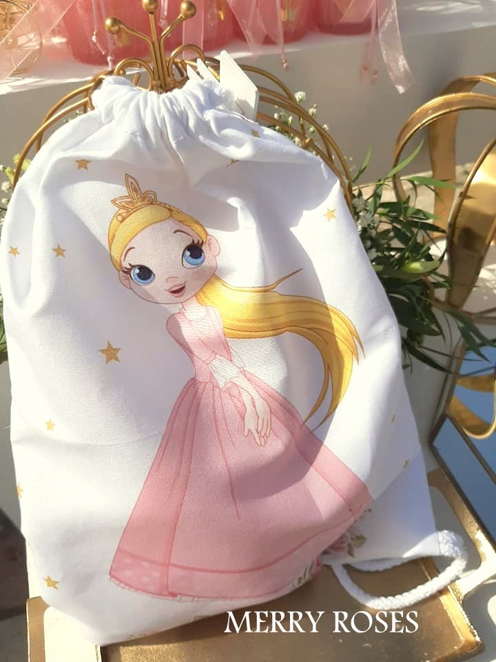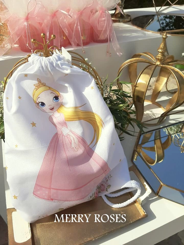 Μπομπονιέρα βάπτισης σακίδια πλάτης back bag με θέμα πριγκίπισσα,διπλής όψης εκτύπωση στο σακίδιο.