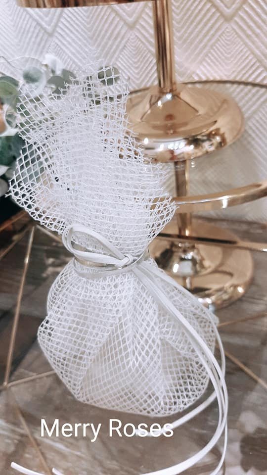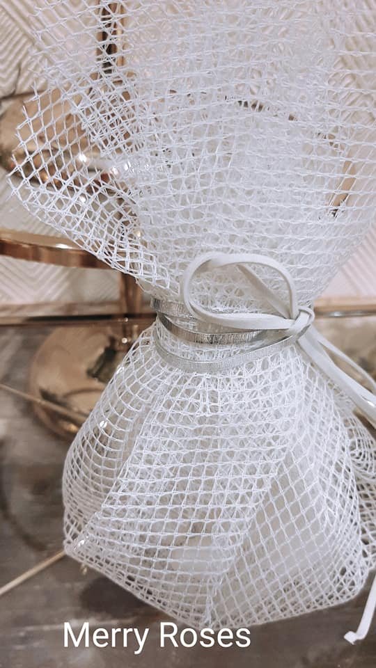 Μπομπονιέρα Γάμου Με Δίχτυ Λευκό και Ασημένια Διακοσμητική Ράβδο Σφυρήλατη