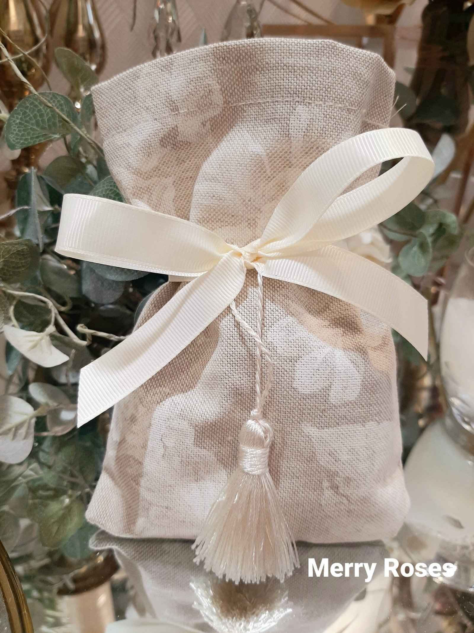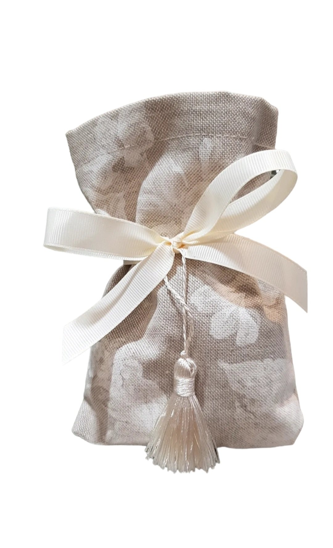 Μπομπονιέρα πουγκί υφασμάτινο 12×17 εκ με λευκά λουλούδια και φούντα.