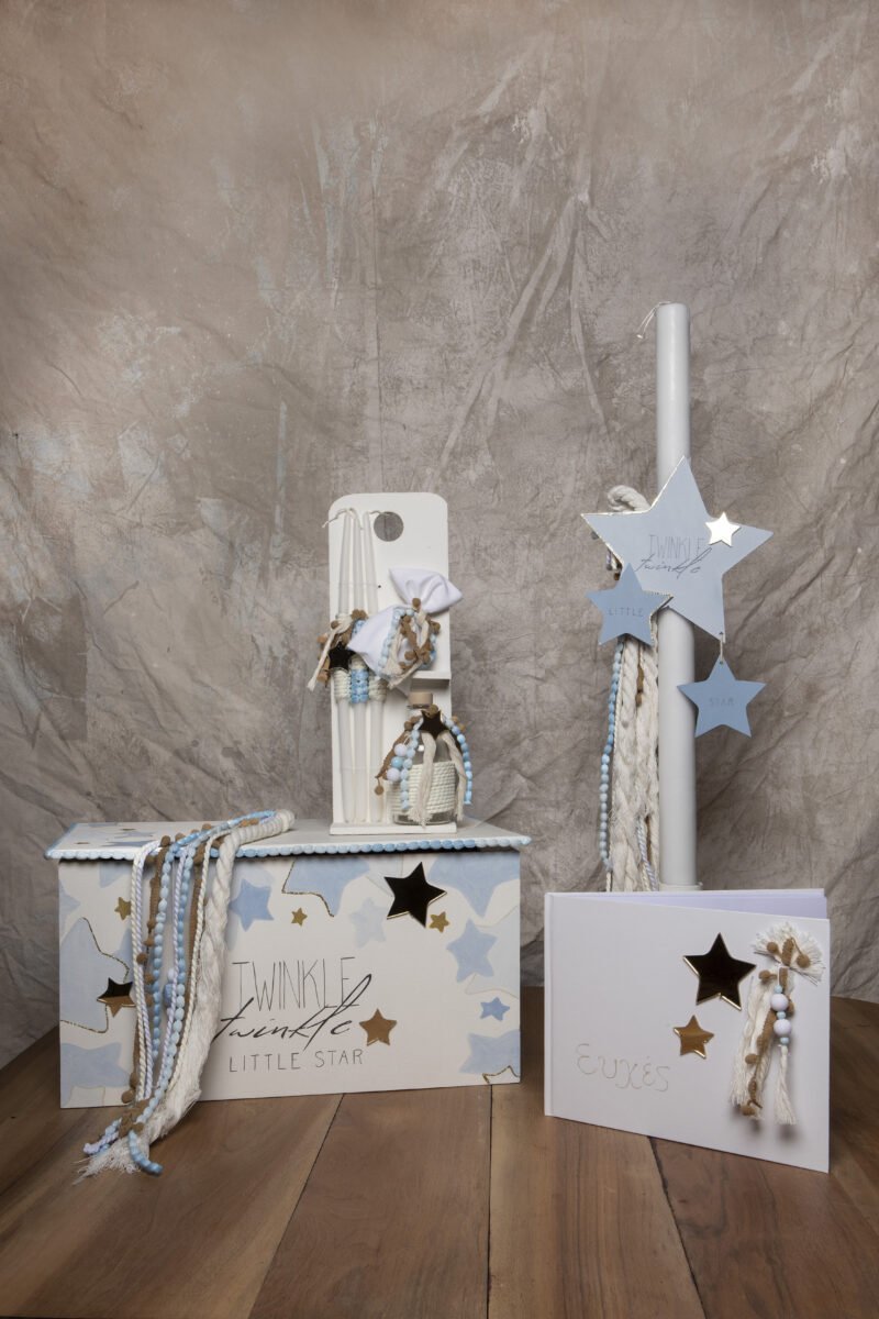 Πακέτο βάπτισης ξύλινο κουτί με θέμα little star , ιδιαίτερη χειροποίητη λαμπάδα με ζωγραφική στο ιδιο θέμα και πλούσιο στολισμό, σετ λαδιού ( 3 κεράκια , μπουκαλάκι λαδιού και σαπουνάκι ) . Κάθε πακέτο βάπτισης μπορεί να στολιστεί με οποιοδήποτε ρούχο και θέμα της επιλογής σας.