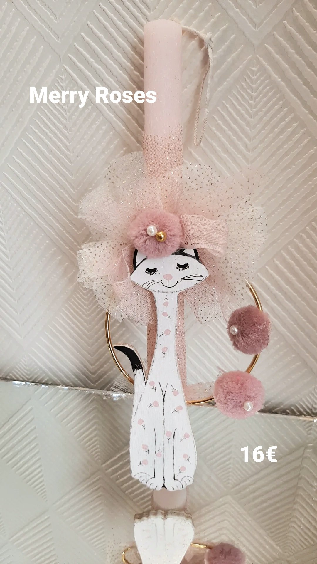 Παραμυθένια Αρωματική Πασχαλινή Λαμπάδα με Γατούλα διακοσμητική σε χρυσό στεφάνι κρεμαστό.