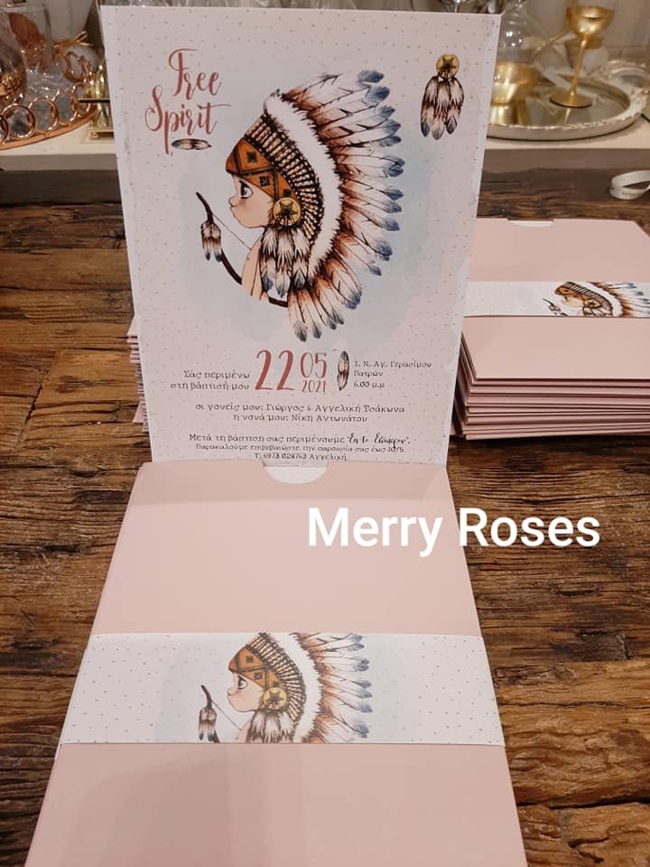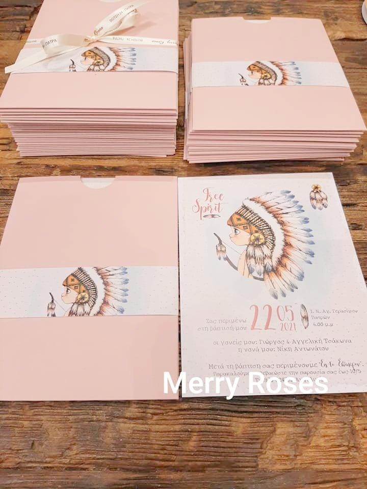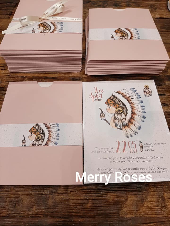 Προσκλητήριο βάπτισης η μικρή ινδιάνα little indian. Ο φάκελος παραλληλόγραμμος συρταρωτός με εγκοπή στο επάνω μέρος και με τρέσσα ασορτί, διάστασης 21,5 X 16 cm 250γρ