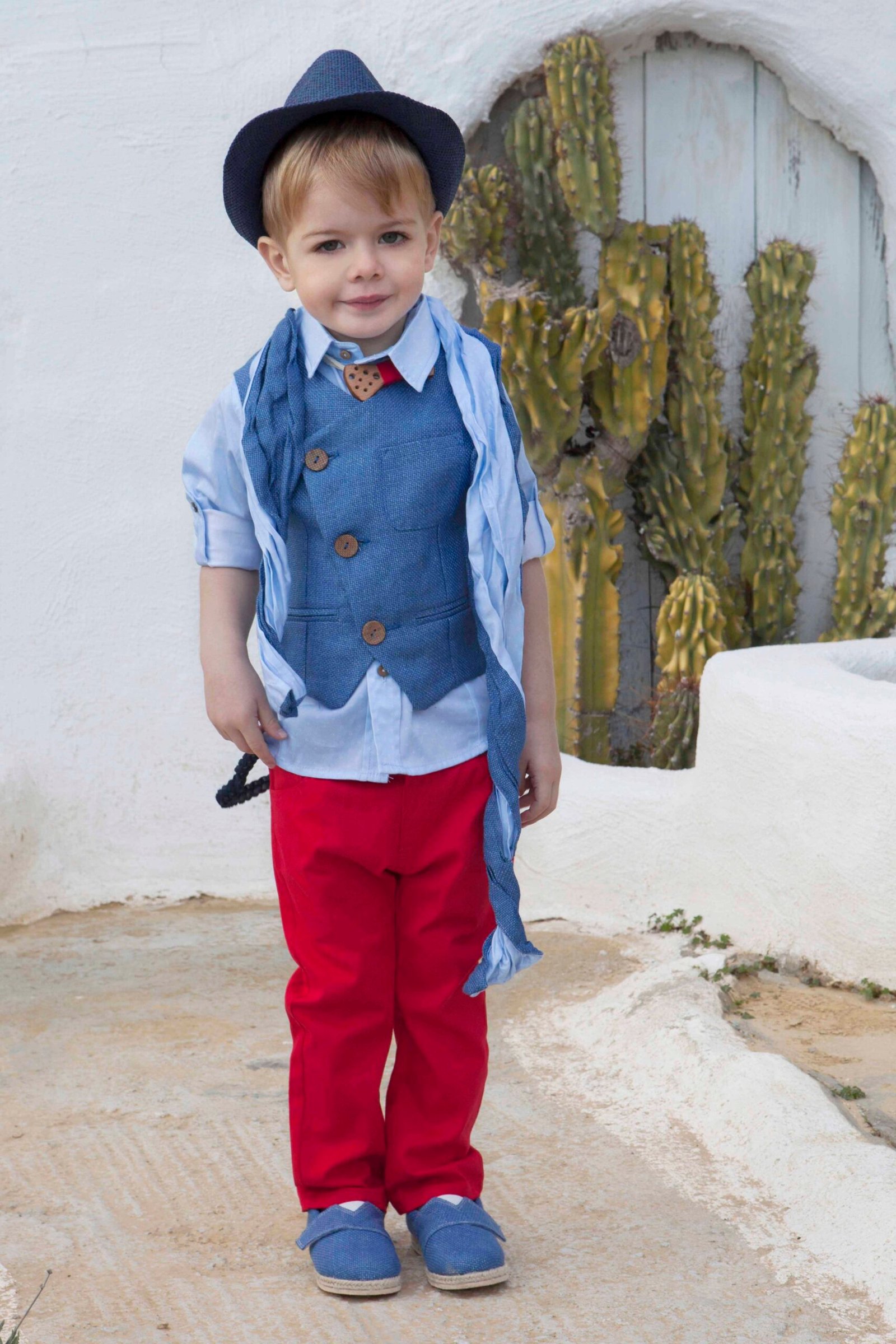 Μοντέρνο σετ βάπτισης 7 τεμαχίων που το χαρακτηρίζουν τα ανατρεπτικά χρώματα που έχουν συνδυαστεί. Περιλαμβάνει γιλέκο σιέλ ψάθα πλάγιο με τρία κουμπιά . Το πουκάμισο είναι βαμβακερό σε σιέλ απόχρωση με διακριτικό print και παντελόνι κόκκινη καμπαρτίνα. Στο σετ περιλαμβάνονται τιράντες, ξύλινο παπιγιόν, δίχρωμο φουλάρι και ψάθινο καπέλο ή μπερές.