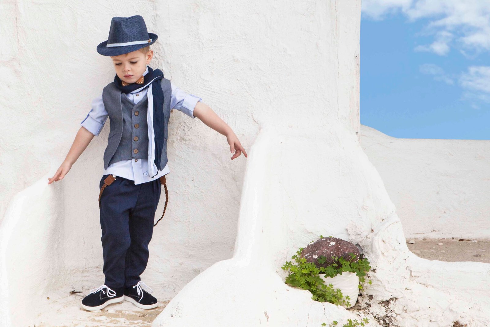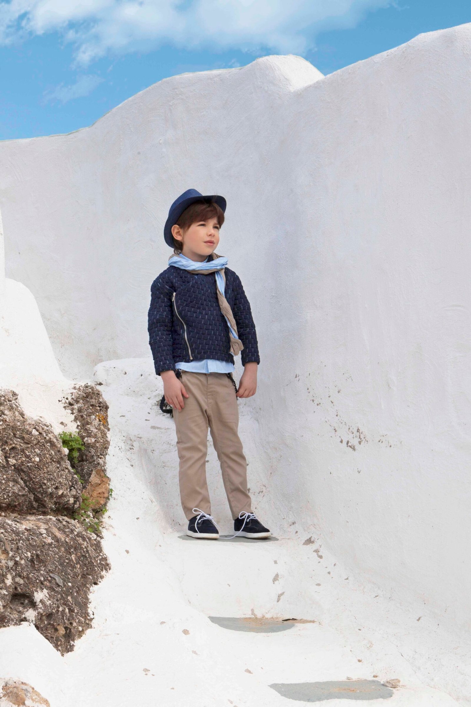 Βαπτιστικό σετ σε αποχρώσεις μπλε-σπαγγι. Ζακέτα ανάγλυφη με λοξό κούμπωμα με φερμουάρ. Το πουκάμισο είναι σιέλ βαμβακερό και το παντελόνι εκρού σπαγγί καμπαρτίνα. Στο σετ περιλαμβάνονται τιράντες, ξύλινο παπιγιόν, δίχρωμο φουλάρι και ψάθινο καπέλο ή μπερές.