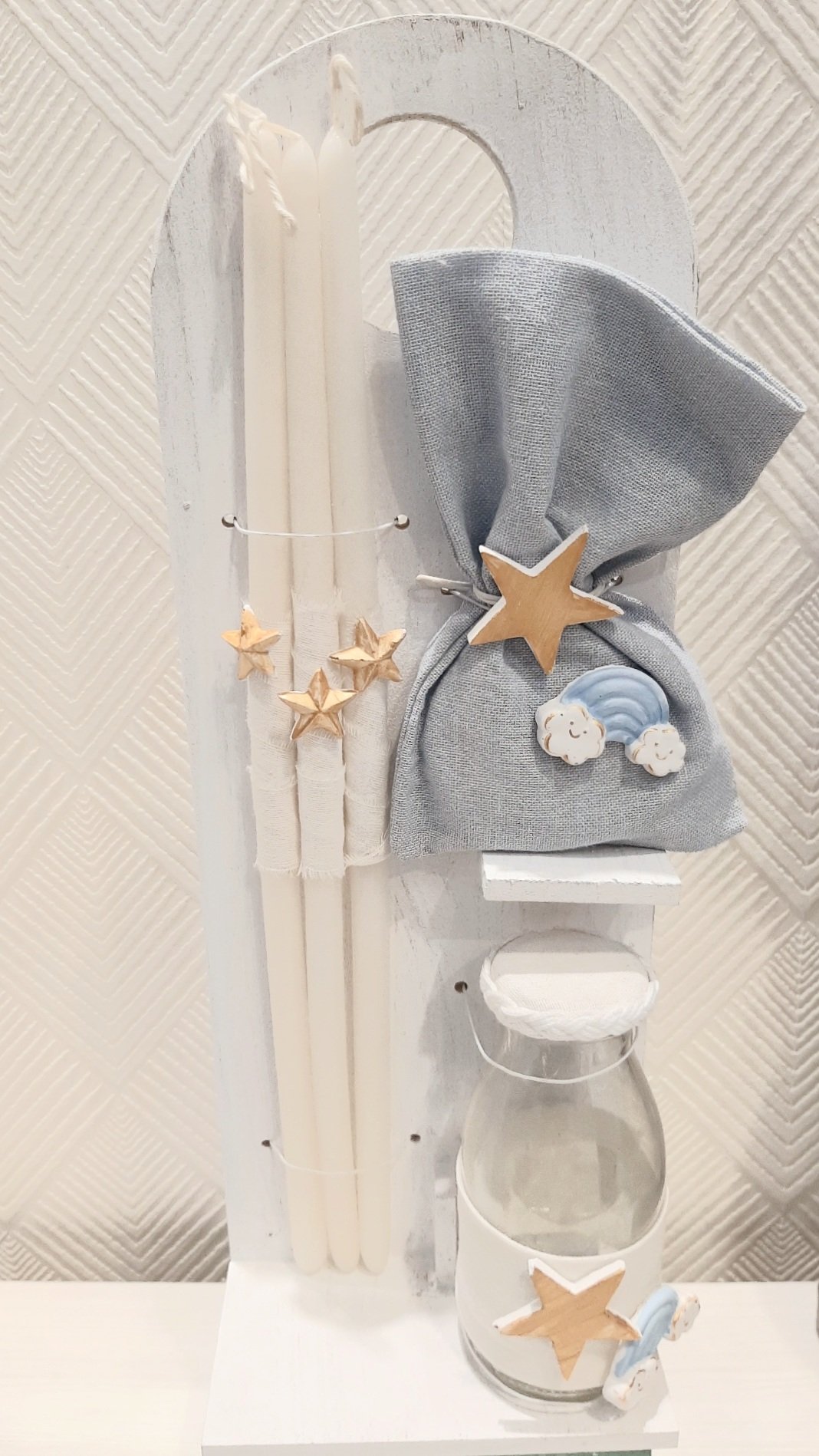 Λαδοσέτ (μπουκάλι λαδιού, 3 κεράκια, σαπούνι) σε σταντ.
