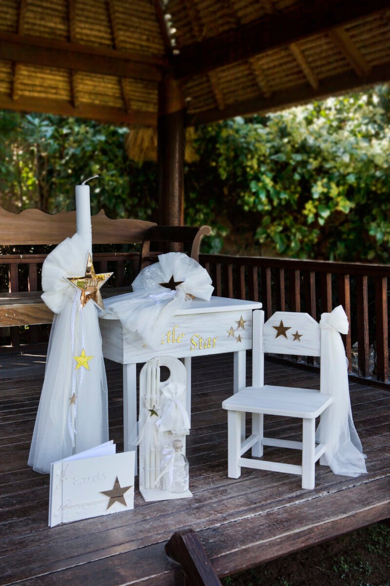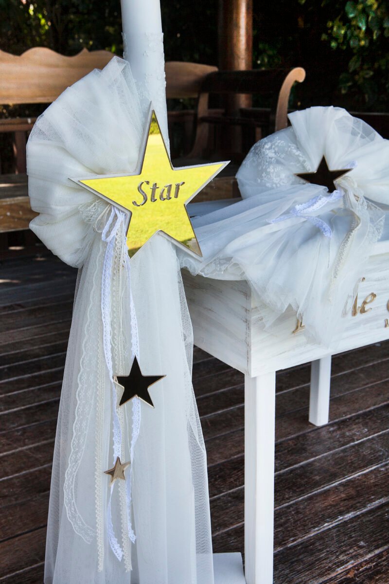 Κ 21.09 ΘΡΑΝΙΟ με πλούσιο στολισμό από τούλια και ιδιαίτερη ανάγλυφη δανδελα μαζί με το καρεκλάκι του με προτεινόμενο θέμα little Star σε plexy glass καθρέφτη, ασορτί λαμπάδα με τον ίδιο στολισμό, σετ λαδιού (3 κεράκια, μπουκαλάκι λαδιού, σαπουνάκι) . Κάθε πακέτο βάπτισης μπορεί να στολιστεί με οποιοδήποτε φόρεμα της συλλογής μας.