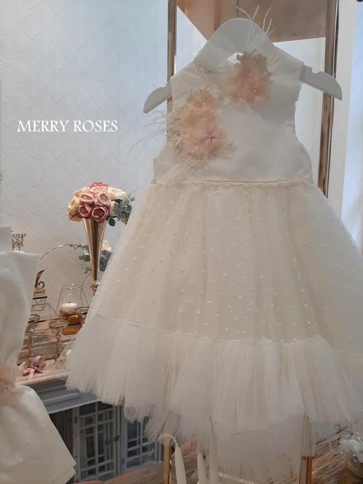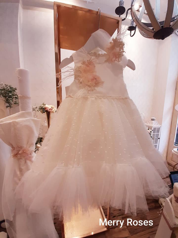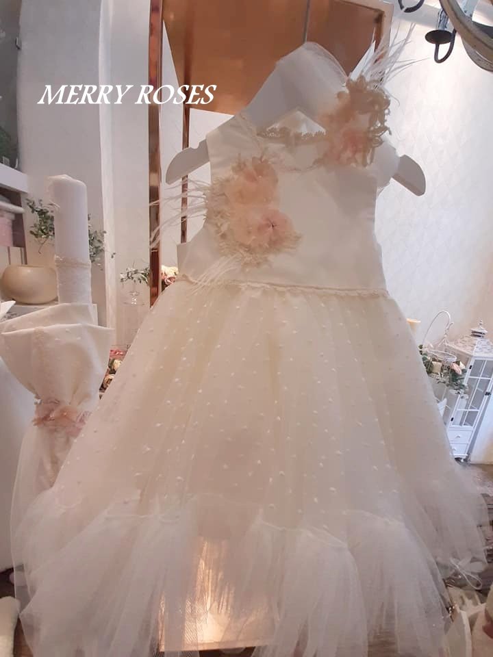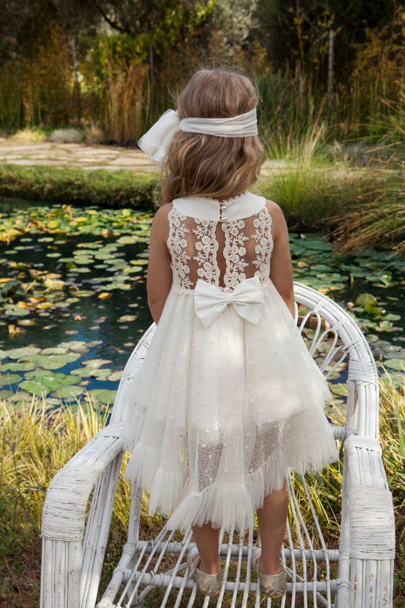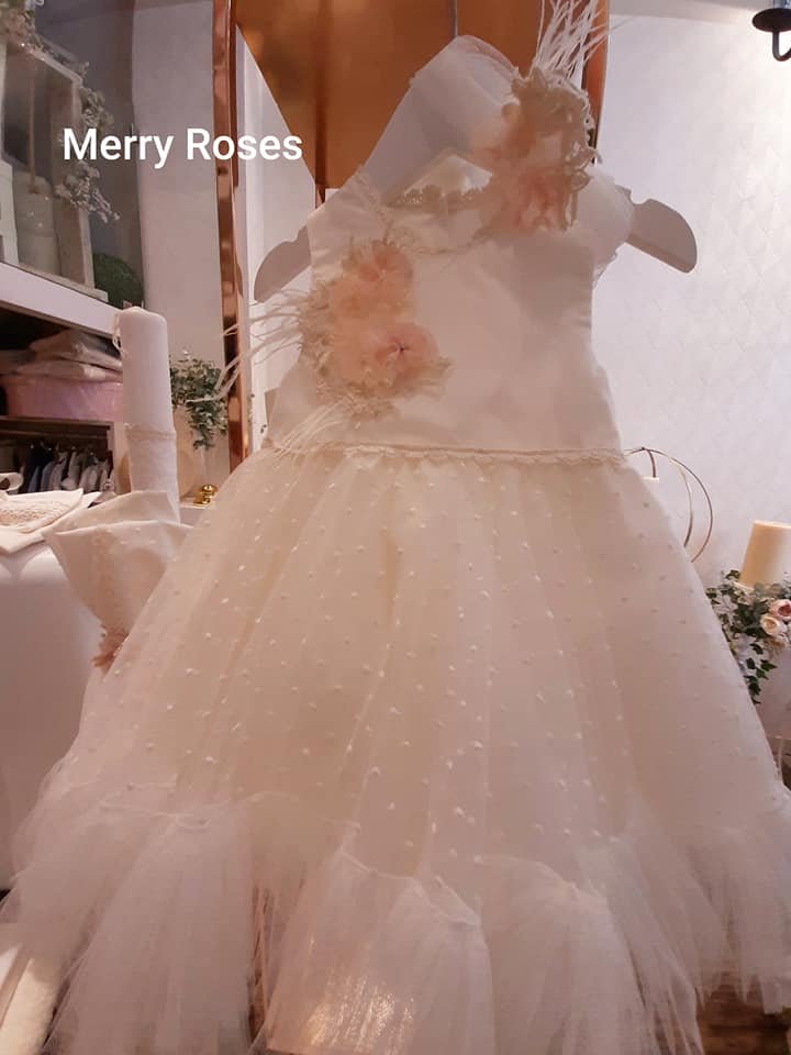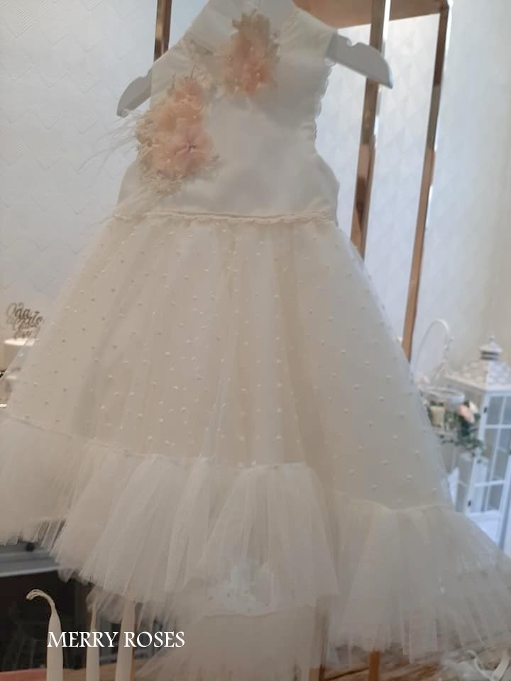 Φόρεμα Βάπτισης που το χαρακτηρίζει η ιδιαίτερη πλάτη από ανάγλυφη δαντέλα με διαφάνεια . Το κορσάζ του φορέματος από τούλι και εσωτερική επένδυση απο μαλακό βαμβακερό ύφασμα που το στολίζει η χειροποίητη σύνθεση λουλουδιών. Το κάτω μέρος του φορέματος αποτελείται από ανάγλυφη δαντέλα και τούλινο βολάν στο τελείωμα που προσδίδει αέρινη κίνηση στο φόρεμα. Ασορτί κορδέλα με το ίδιο λουλούδι του φορέματος και κατ’ επιλογή μπαντάνα ή τουρμπάνι .