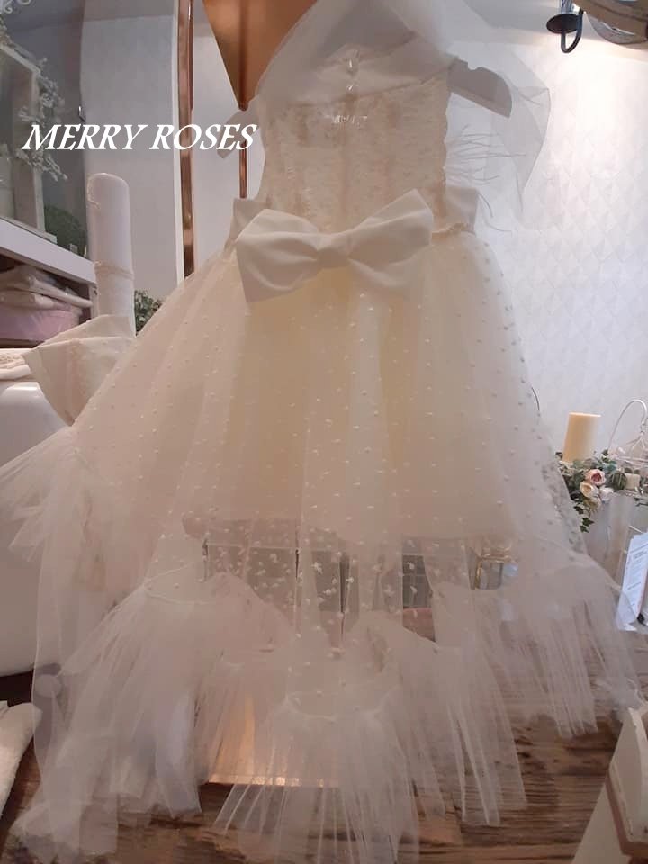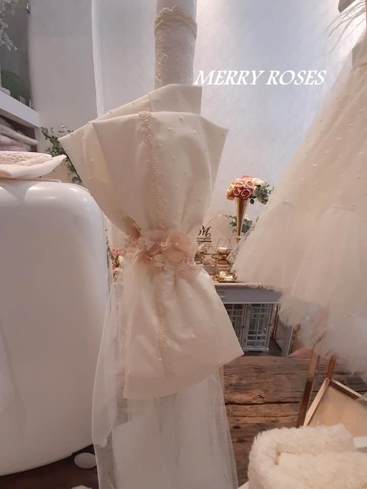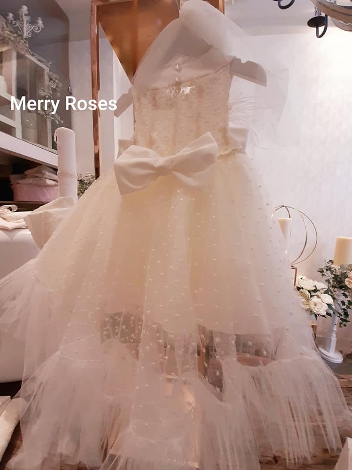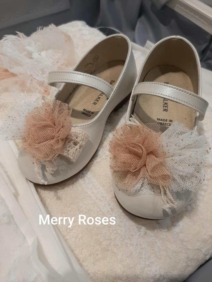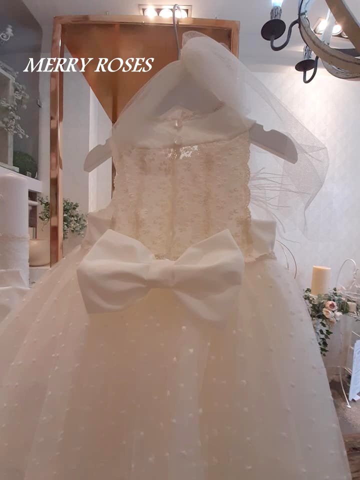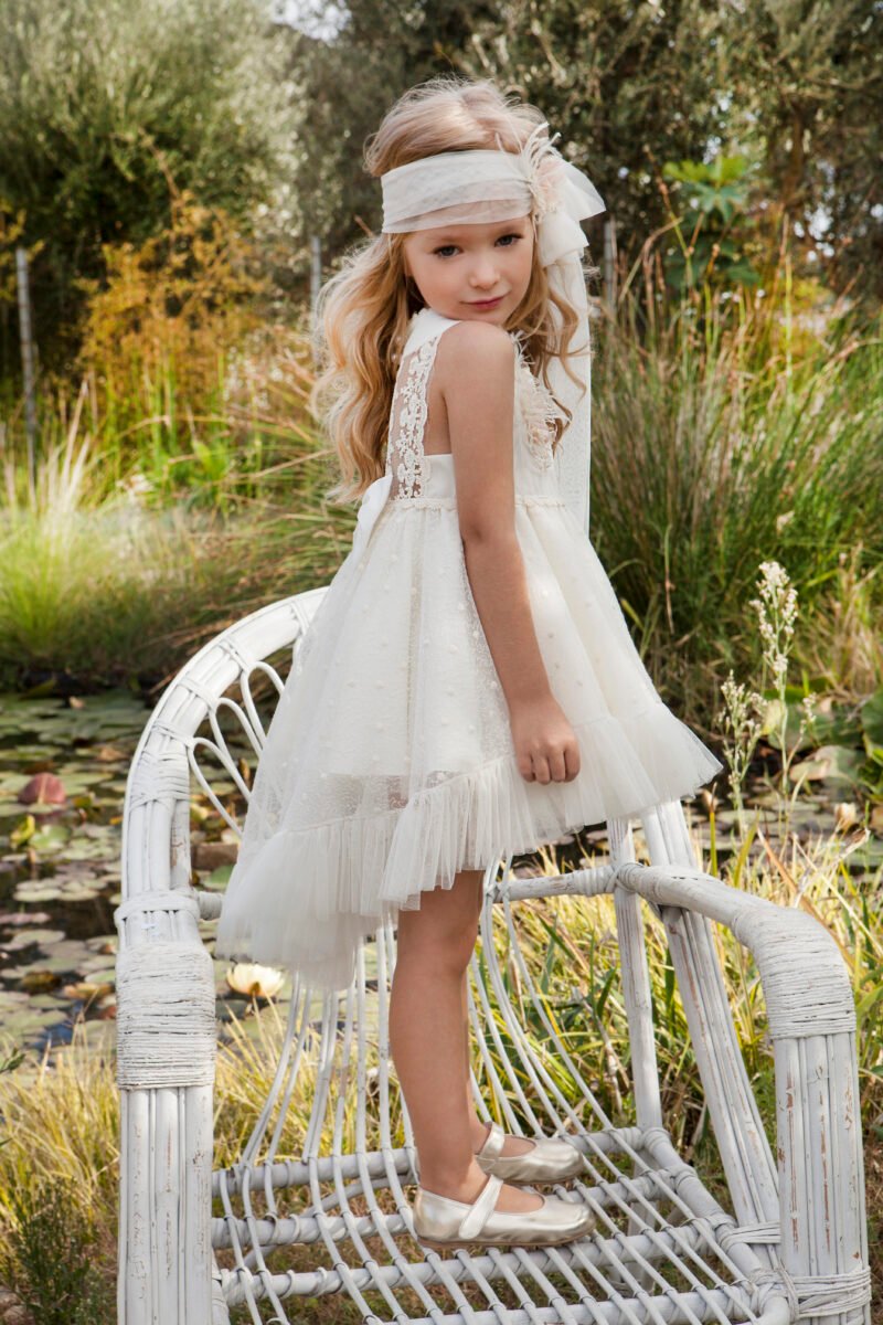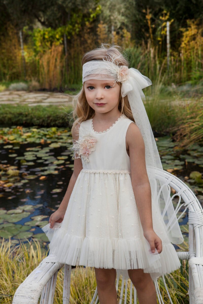 Φόρεμα Βάπτισης που το χαρακτηρίζει η ιδιαίτερη πλάτη από ανάγλυφη δαντέλα με διαφάνεια . Το κορσάζ του φορέματος από τούλι και εσωτερική επένδυση απο μαλακό βαμβακερό ύφασμα που το στολίζει η χειροποίητη σύνθεση λουλουδιών. Το κάτω μέρος του φορέματος αποτελείται από ανάγλυφη δαντέλα και τούλινο βολάν στο τελείωμα που προσδίδει αέρινη κίνηση στο φόρεμα. Ασορτί κορδέλα με το ίδιο λουλούδι του φορέματος και κατ’ επιλογή μπαντάνα ή τουρμπάνι .
