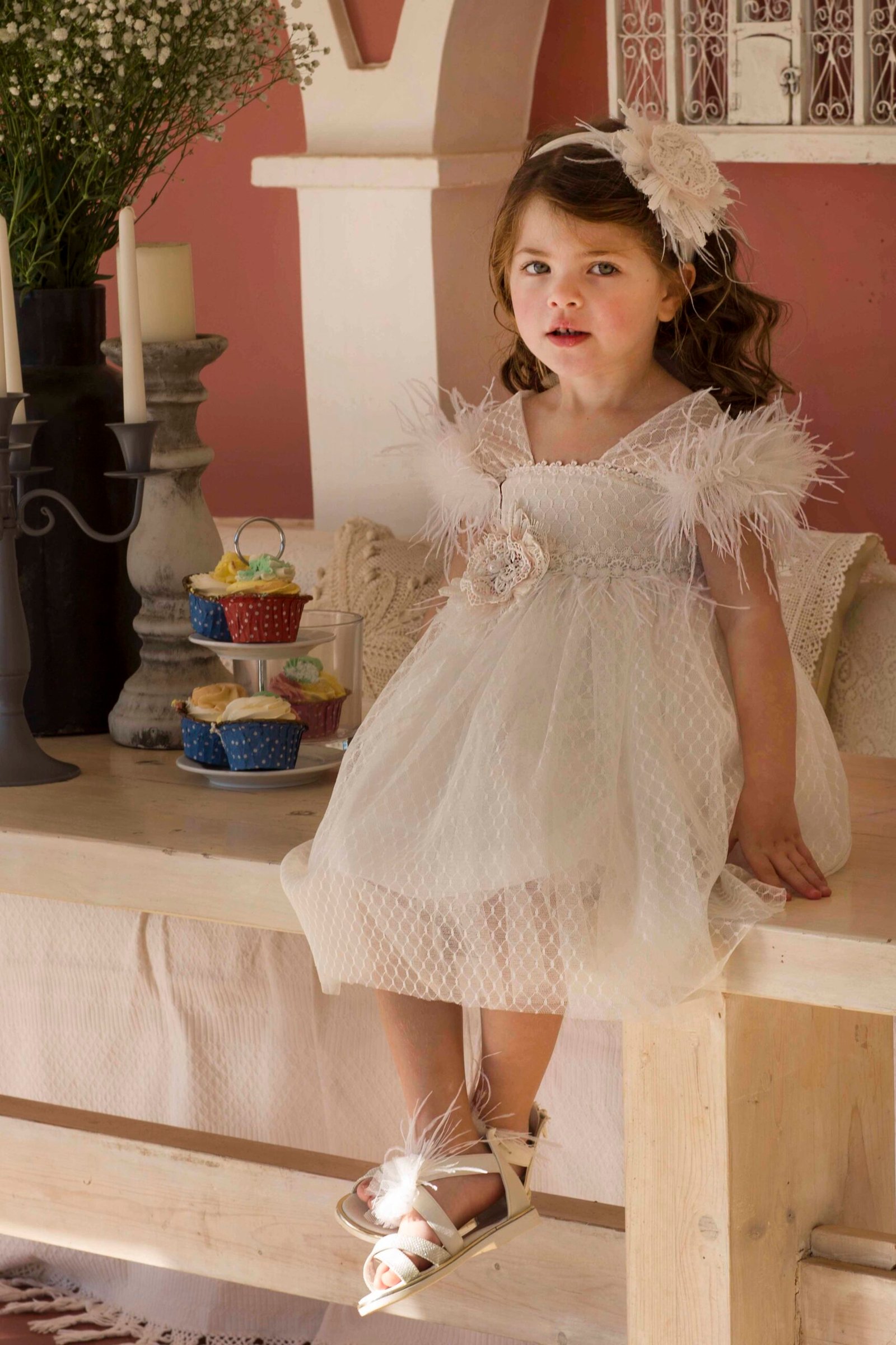 Ρομαντικό φόρεμα βάπτισης Baby Bloom που το χαρακτηρίζει η ιδιαίτερη δανδέλα που διακρίνεται σε όλο της το μήκος του φορέματος. Στο φόρεμα δίνουν μια ιδιαίτερη αισθητική το πλούσιο μανίκι με δανδέλα και πούπουλα maraboo. Τη μέση του φορέματος στολίζει δανδέλα με χειροποίητο λουλούδι με λεπτομέρειες light σάπιο μήλο.