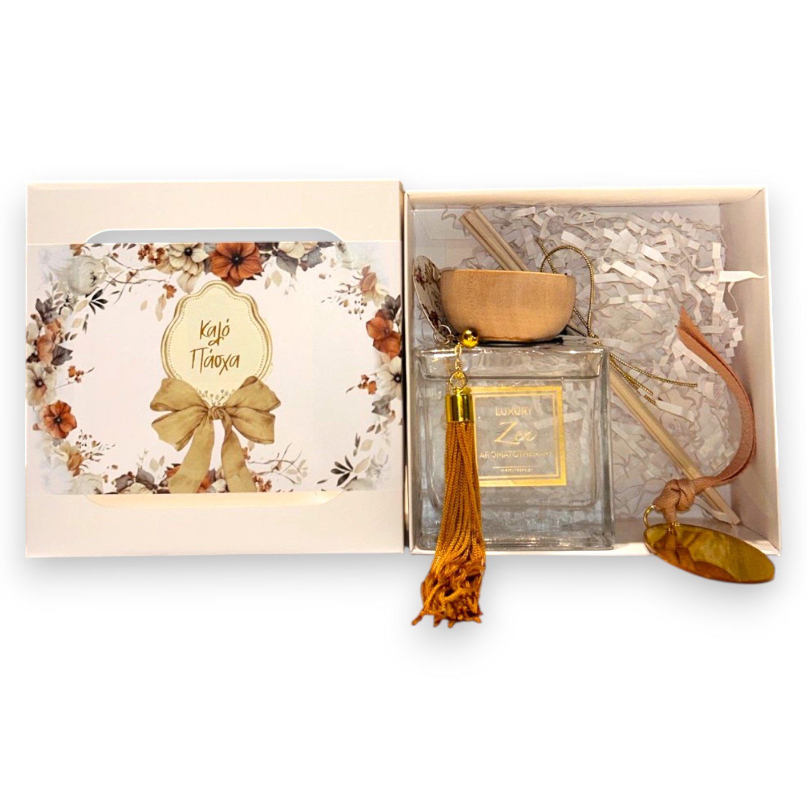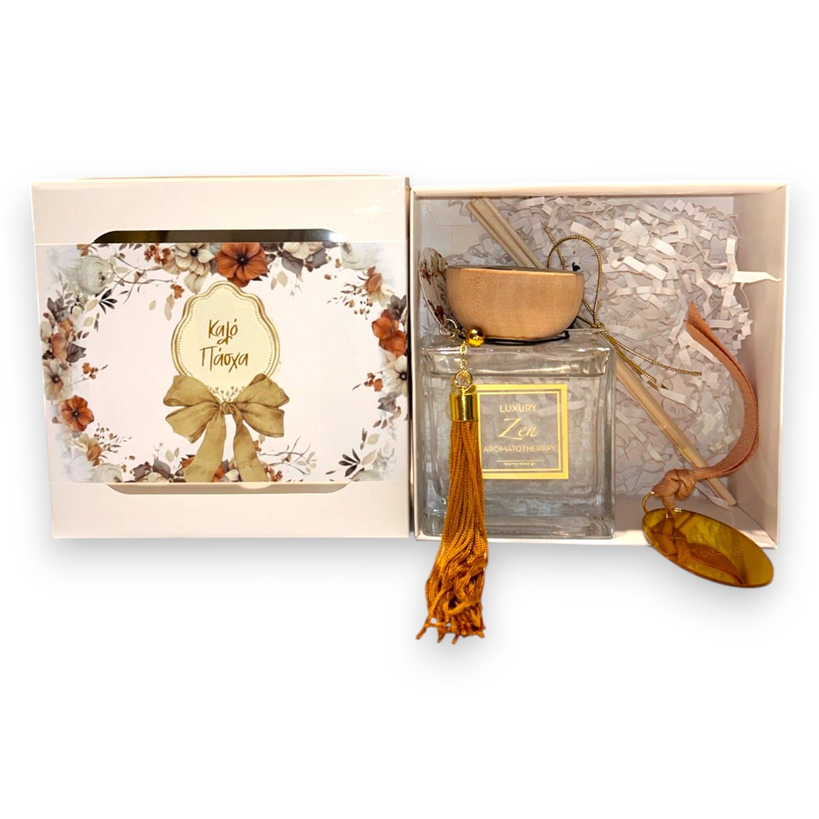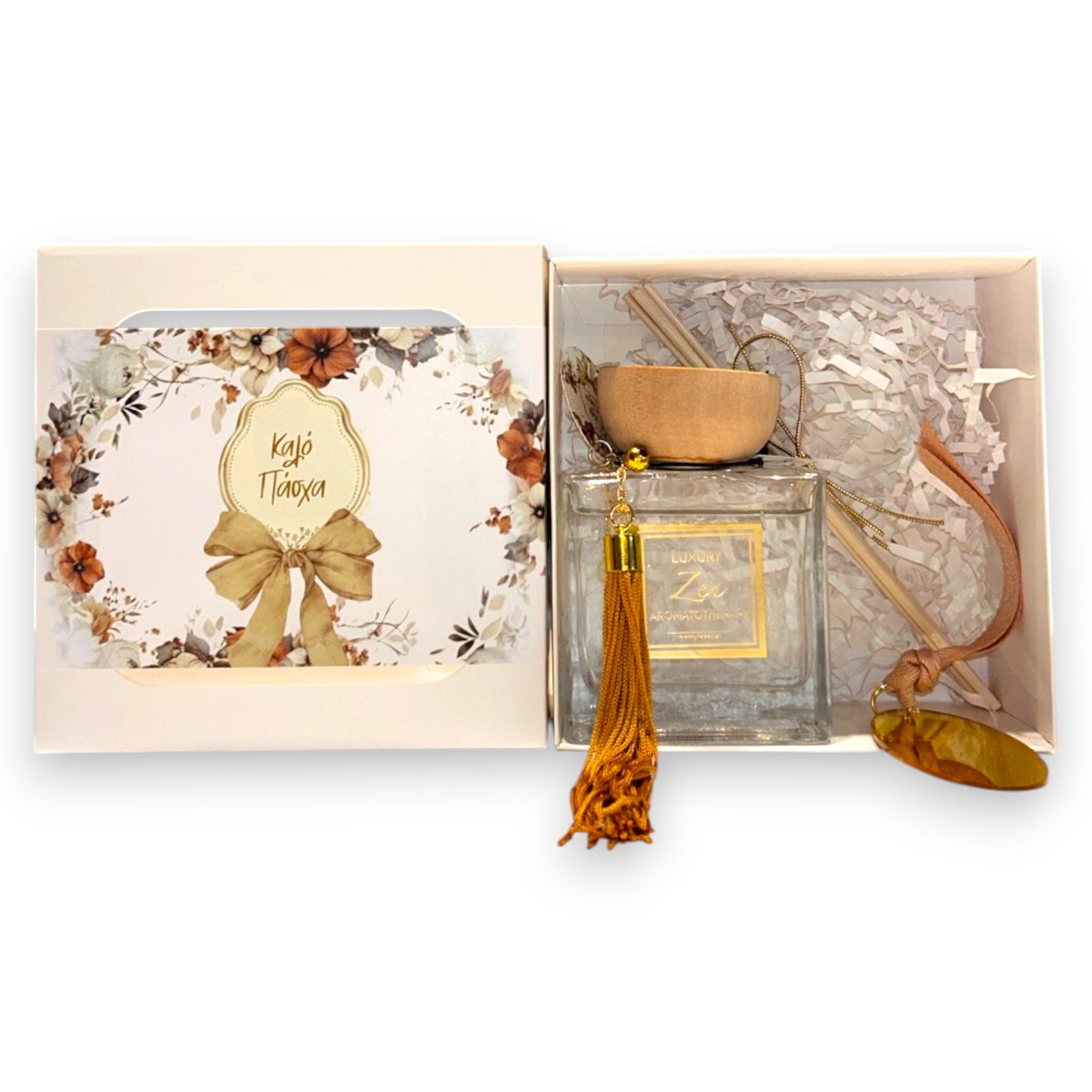 Κομψό αρωματικό χώρου με στικς, τοποθετημένο σε προσεγμένη συσκευασία δώρου με πασχαλινή ευχή. Ιδανική πρόταση για εποχιακές συλλογές, εταιρικά δώρα και καταστήματα που αναζητούν ένα ολοκληρωμένο, έτοιμο προς πώληση προϊόν με premium αισθητική.
