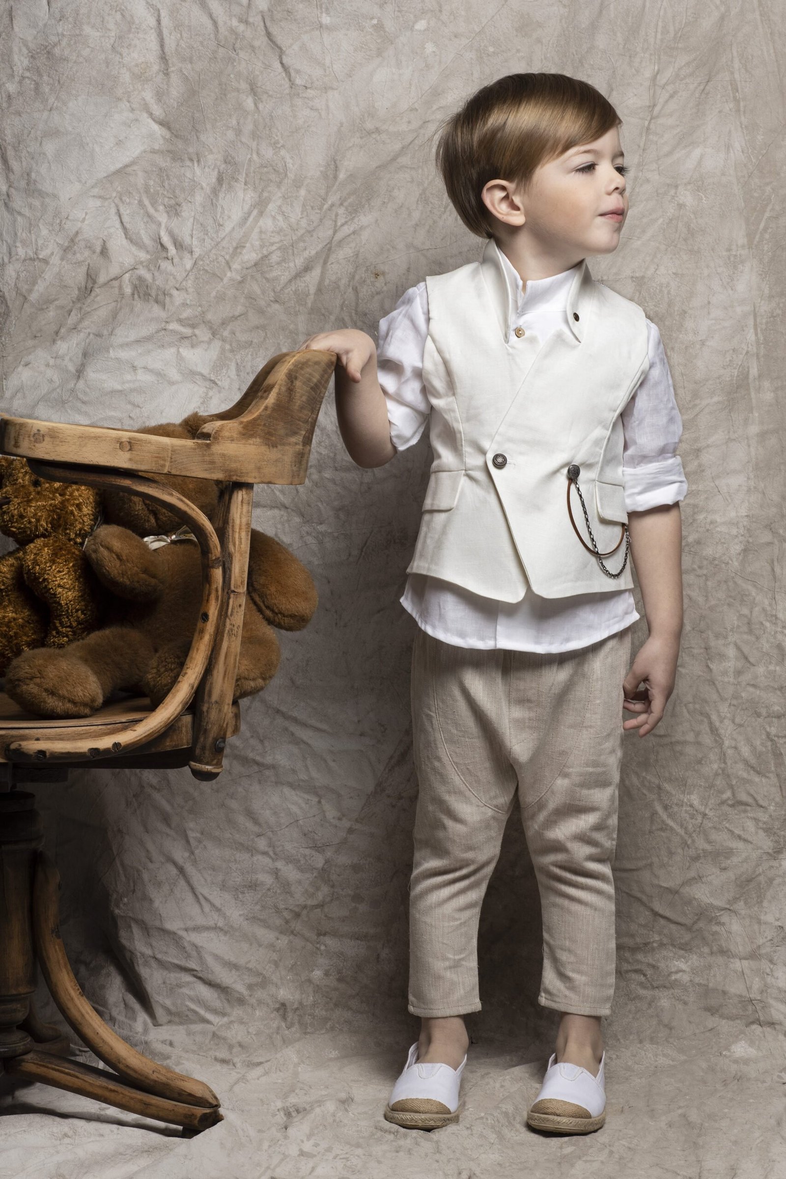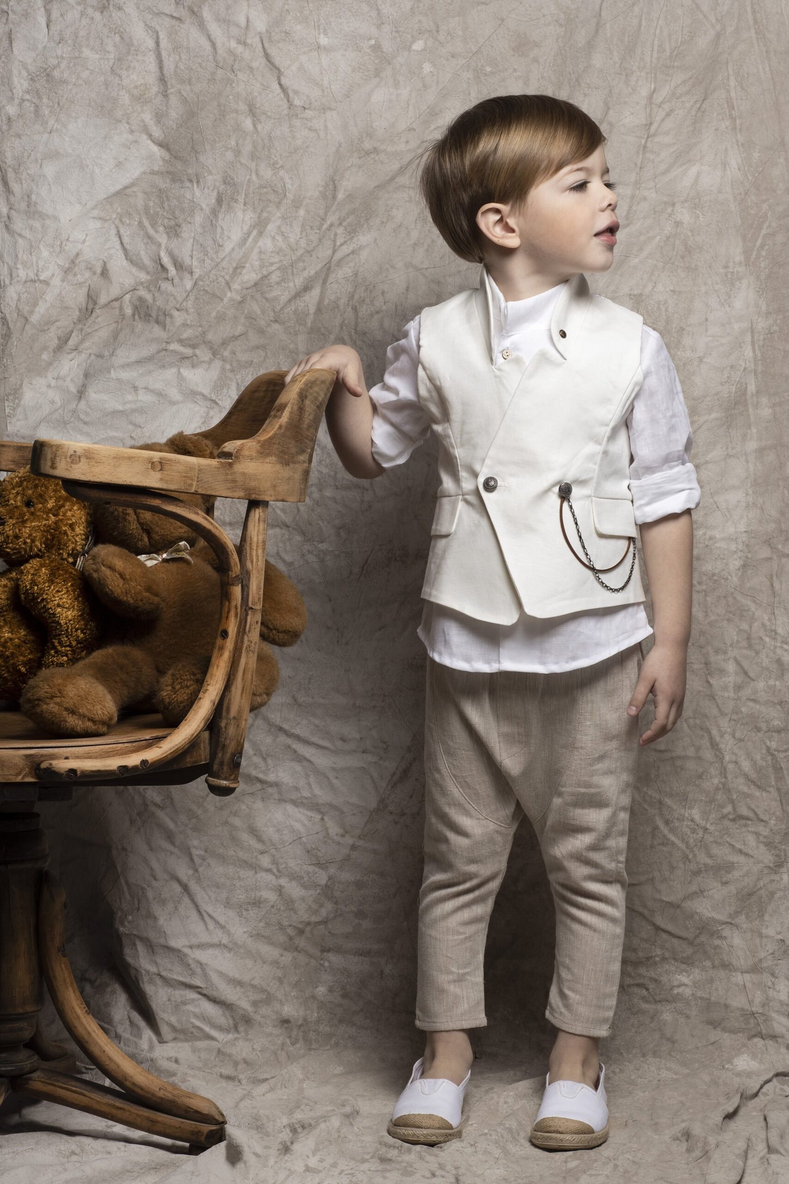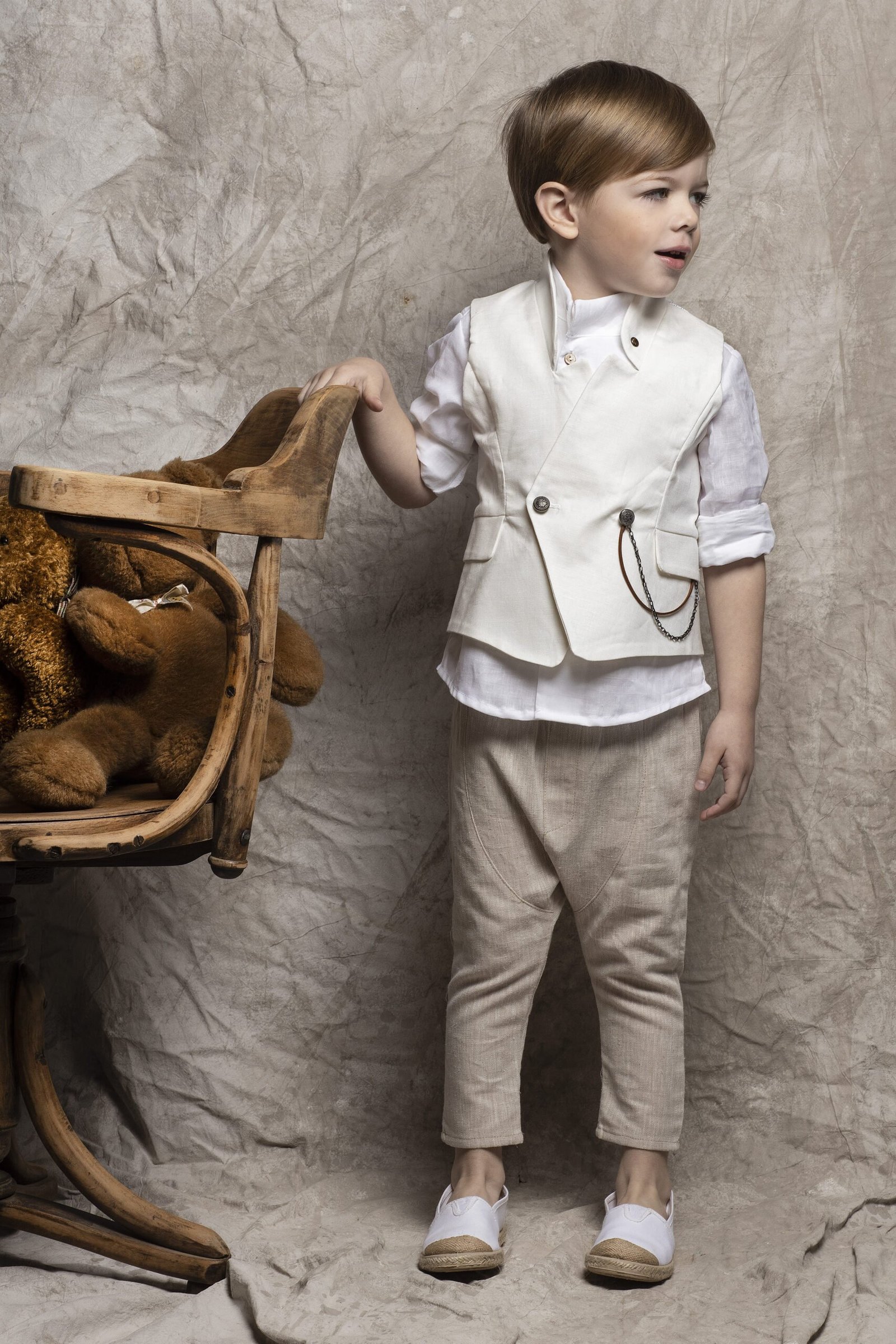Σέτ βάπτισης , ένα κομψό μοντέρνο σετ βάπτισης που αποτελείται από μπέζ λινό παντελόνι , πουκάμισο λευκό λινό πλάγιο , γιλέκο λινό σε λευκή αποχρώση . Στο σετ περιλαμβάνονται επίσης τιράντες και ψάθινο καπέλο ή μπερές.