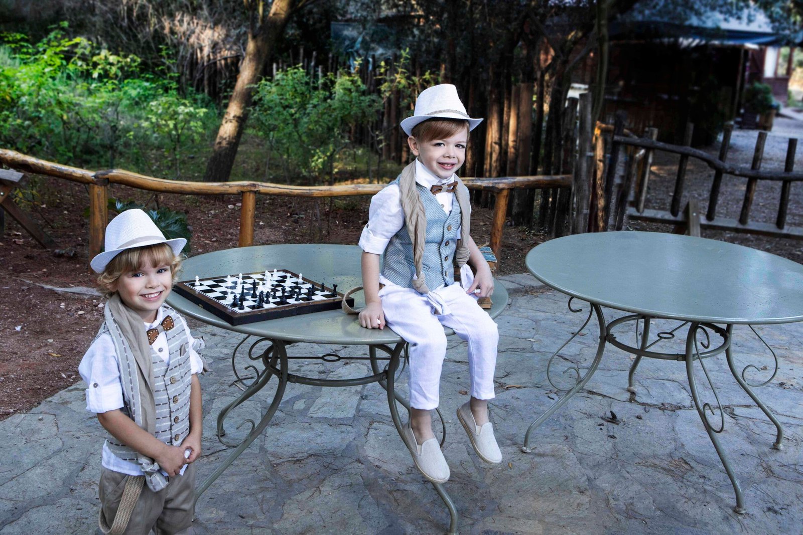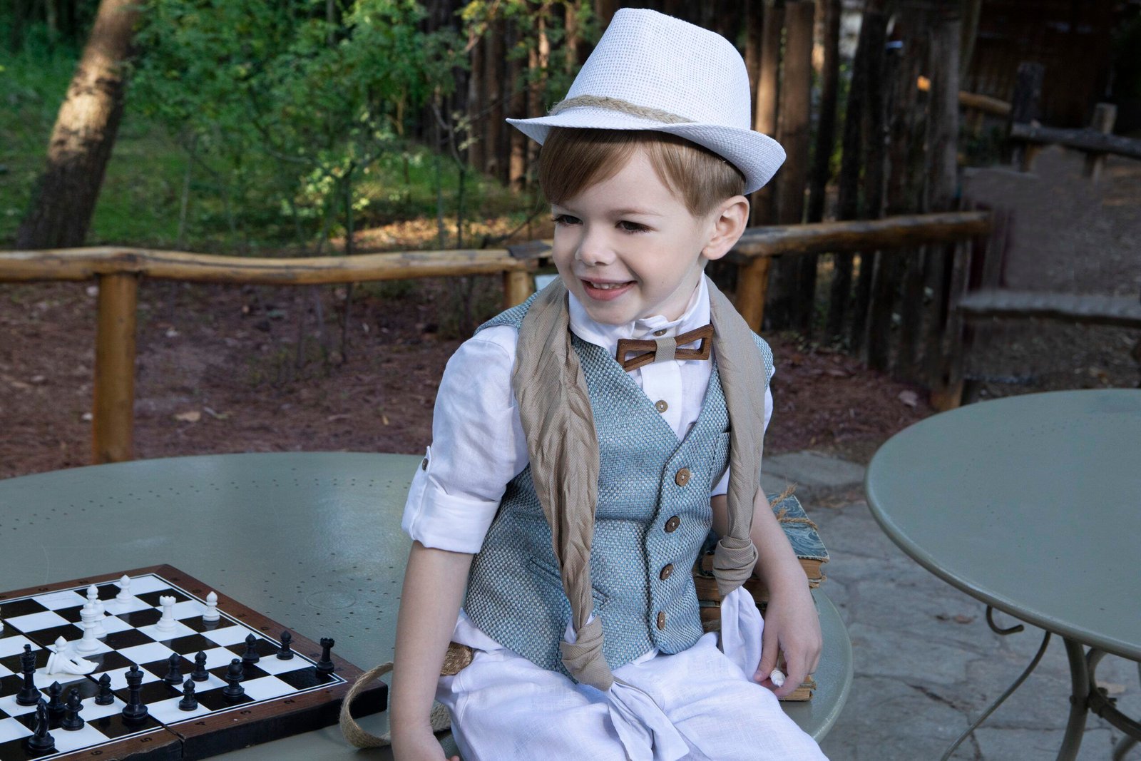 Ο πιο chic συνδυασμός σε αποχρώσεις βεραμάν λευκό που περιλαμβάνει βεραμάν γιλέκο με ιδιαίτερο ανάγλυφο ύφασμα , πουκάμισο  λευκό λινό και  παντελόνι λευκό λινό με πιέτες και πλάγιο κούμπωμα. Στο σετ περιλαμβάνονται τιράντες,  ξύλινο παπιγιόν ,δίχρωμο φουλάρι και ψάθινο καπέλο ή μπερές.