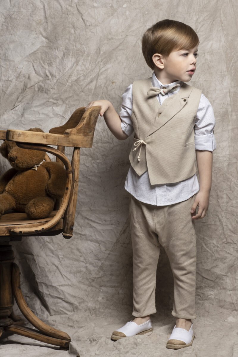 Σέτ βάπτισης , ένα κομψό μοντέρνο σετ βάπτισης που αποτελείται από μπεζ λινό παντελόνι , πουκάμισο βαμβακερό με print , γιλέκο λινό σε απόχρωση μπεζ και ιδιαίτερο κούμπωμα . Στο σετ περιλαμβάνονται επίσης τιράντες ,υφασμάτινο παπιγιόν και ψάθινο καπέλο ή μπερές.