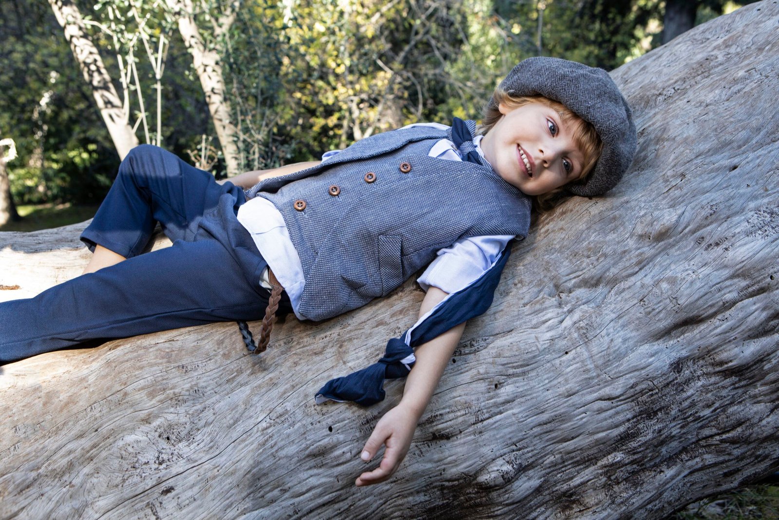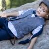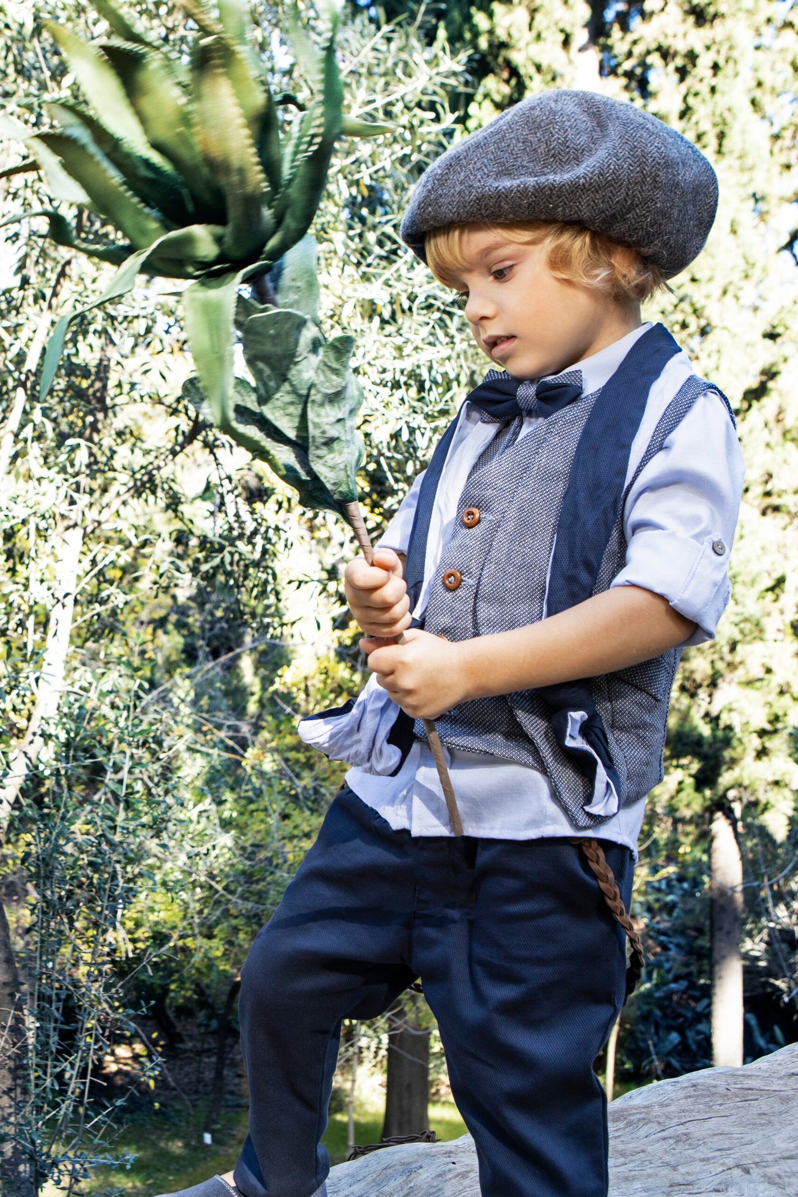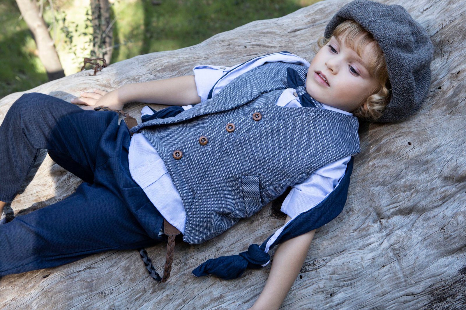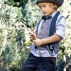 Σέτ βάπτισης σε αποχρώσεις μπλε- σιέλ. Το σετ περιλαμβάνει γιλέκο μπλε με ιδιαίτερο σχέδιο , πουκάμισο oxford σε σιέλ απόχρωση και παντελόνι μπλε καμπαρτίνα με ανάγλυφη υφή ,τιράντες , υφασμάτινο παπιγιόν ,δίχρωμο φουλάρι και ψάθινο καπέλο ή μπερές.
