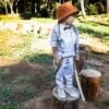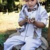 Ένα total white σετ με σπαγγί λεπτομέρειες γιλέκο με πλάγιο κούμπωμα, λευκό λινό πουκάμισο και παντελόνι με πιέτες και λοξό κούμπωμα, δίχρωμο φουλάρι λευκό σπαγγί, τίράντες, ξύλινο παπιγιόν ,καπέλο ψάθινο ή μπερές .