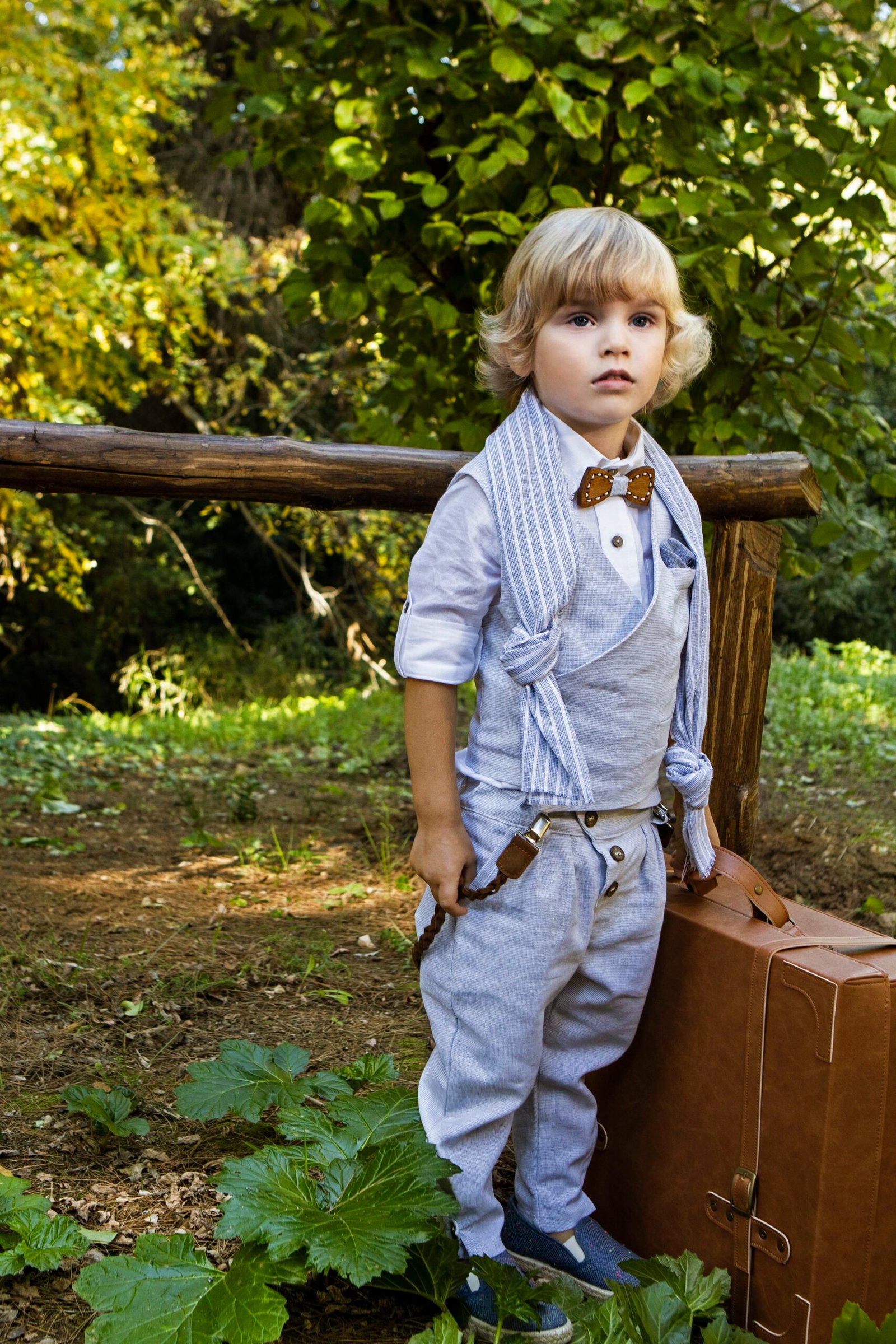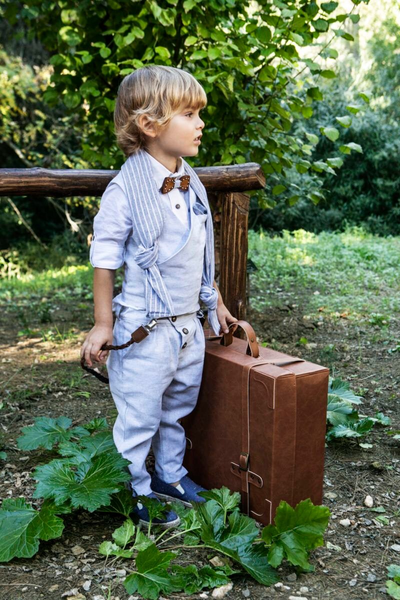 Ένα ιδιαίτερο , σε light grey απόχρωση . Αποτελείται από γιλέκο με πλάγιο κούμπωμα, λευκό λινό πουκάμισο και παντελόνι με πιέτες και λοξό κούμπωμα, δίχρωμο φουλάρι , τιράντες, ξύλινο παπιγιόν ,καπέλο ψάθινο ή μπερές .