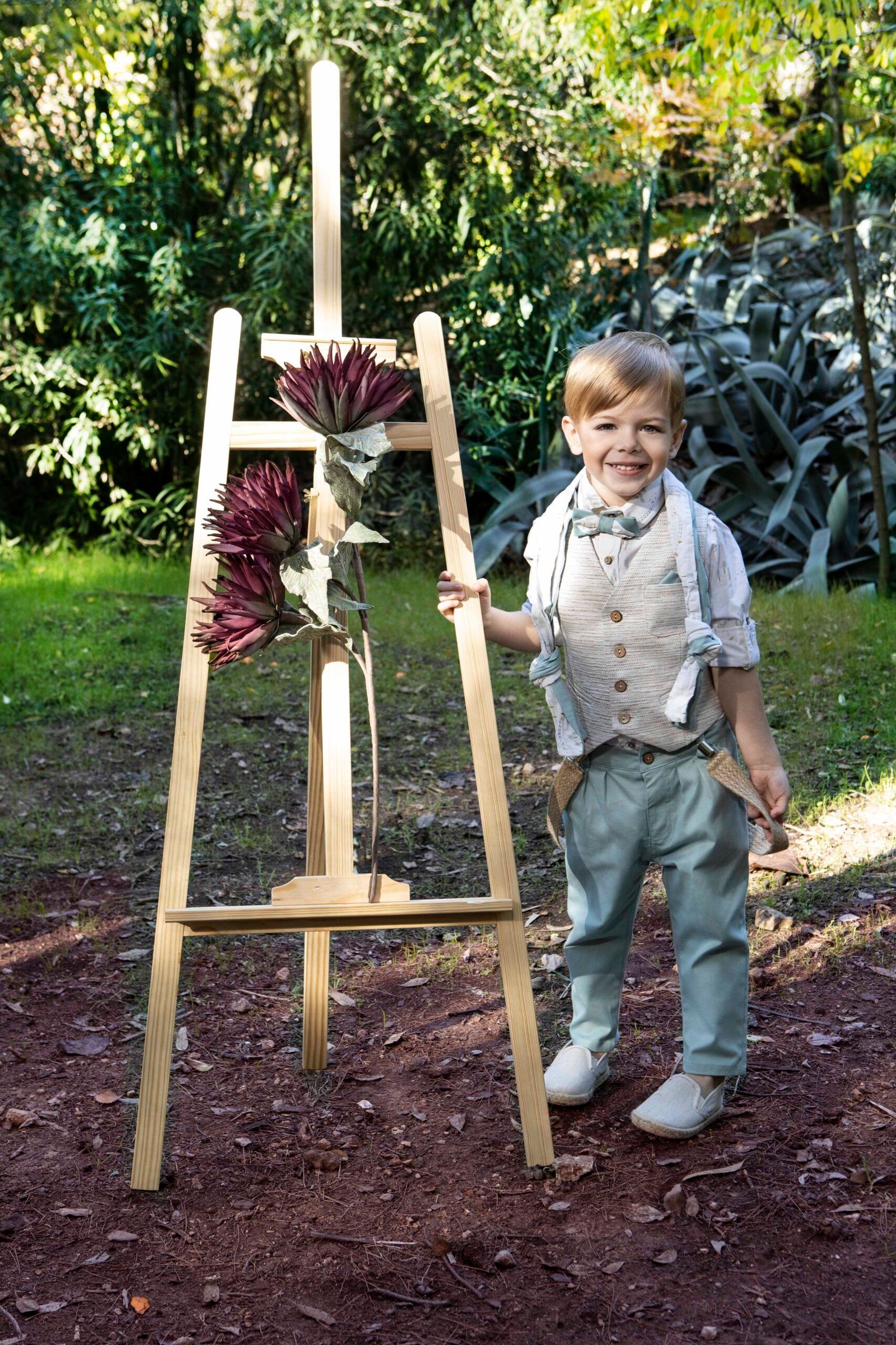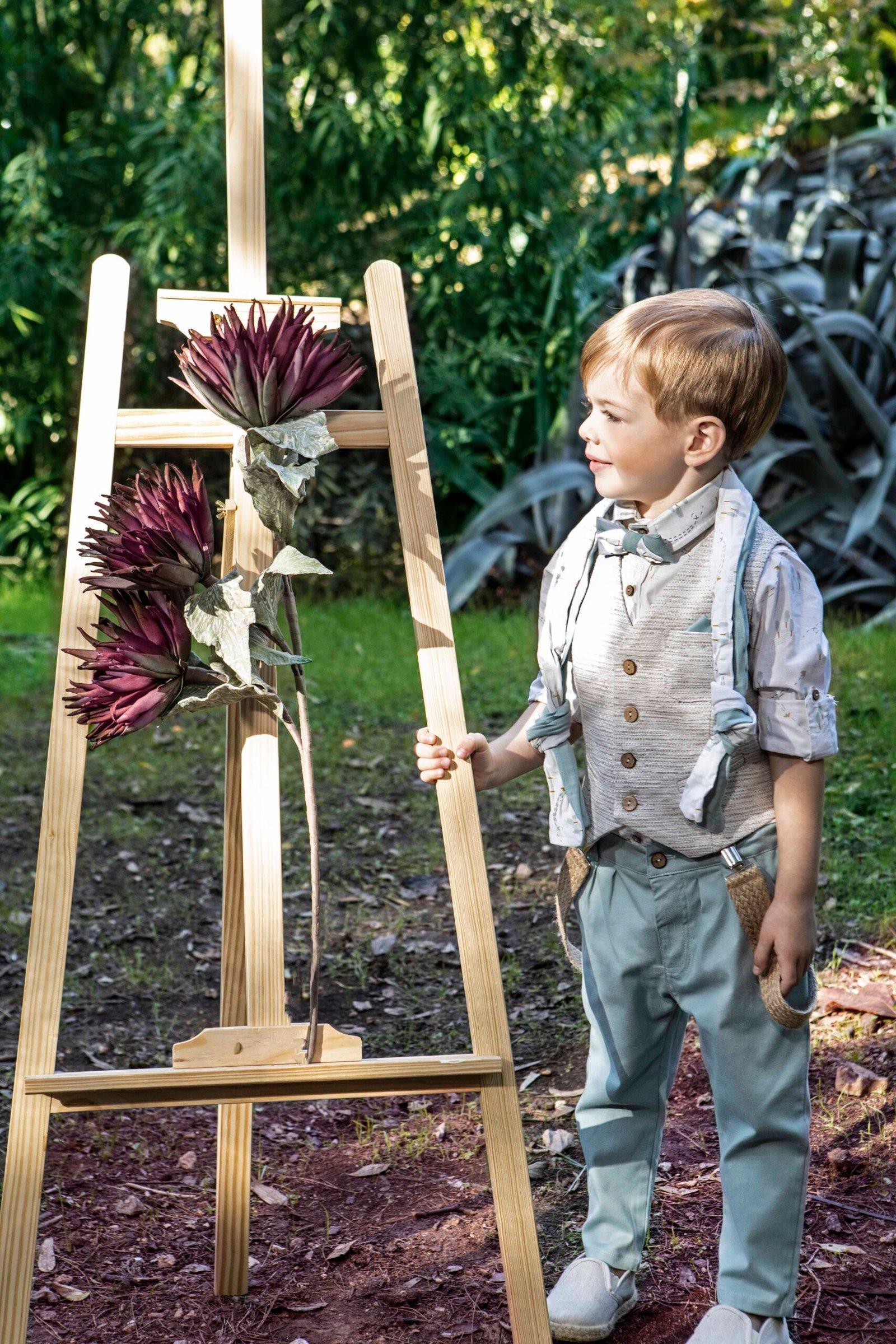 Από τις πιο trendy προτάσεις της συλλογής  ,ένα κομψό μοντέρνο σετ 7 τεμαχίων που αποτελείται από βεραμάν καμπαρτίνα παντελόνι, πουκάμισο ιβουάρ με ιδιαίτερο print και γιλέκο μπεζ της άμμου. Στο σετ περιλαμβάνονται επίσης τιράντες, υφασμάτινο παπιγιόν, δίχρωμο φουλάρι και ψάθινο καπέλο ή μπερές.