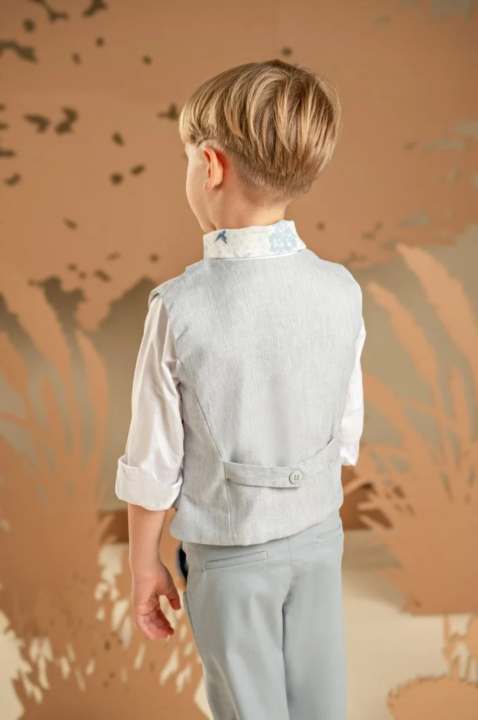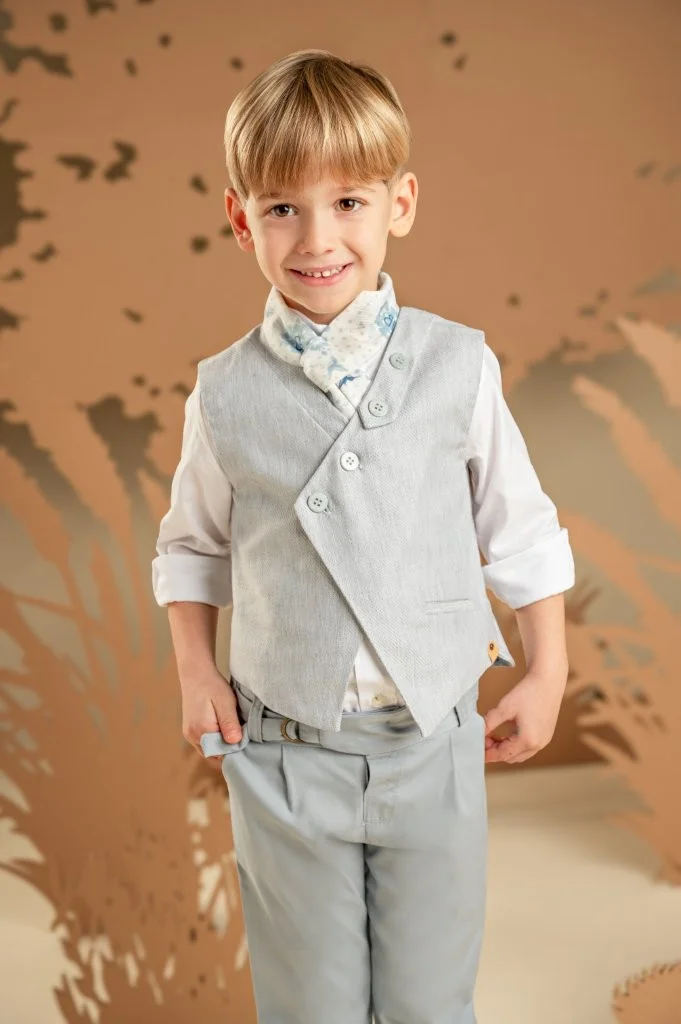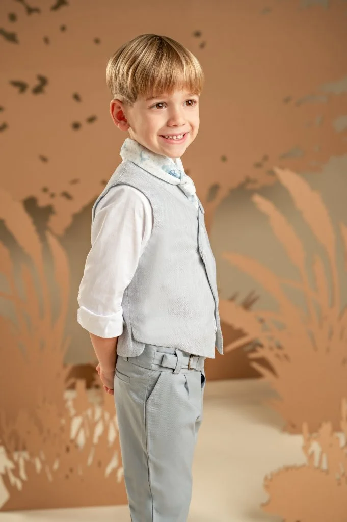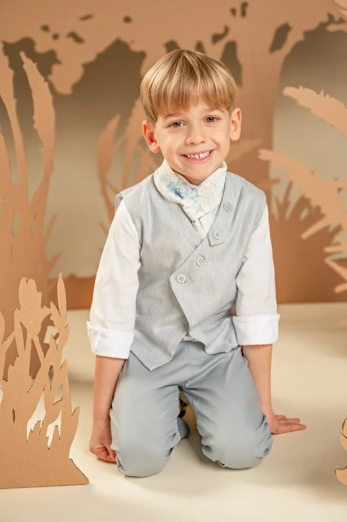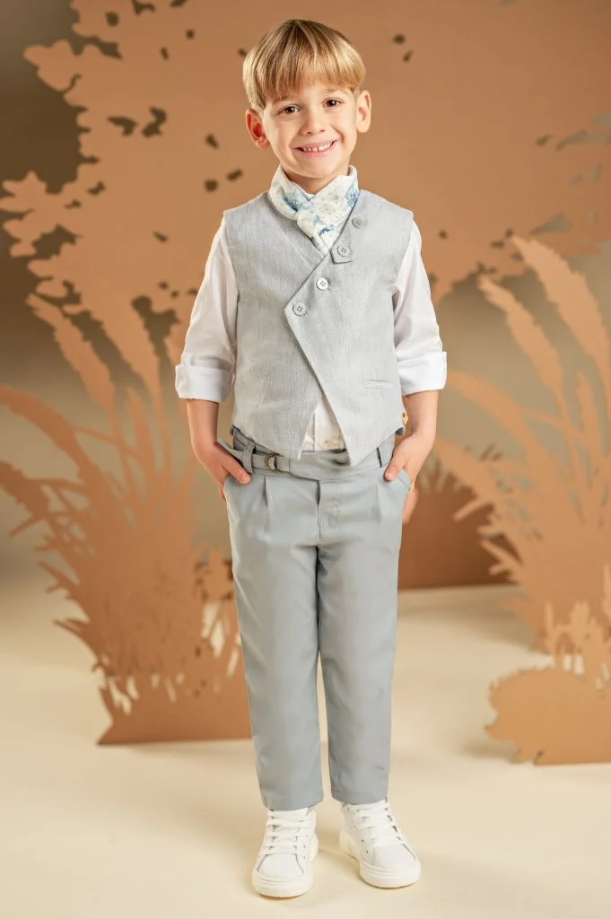 Ένα πανέμορφο σετ που κερδίζει τις εντυπώσεις με τις απαλές χρωματικές αποχρώσεις και τις κομψές λεπτομέρειες. Παντελόνι από Tencel-viscose ύφασμα σε σιελ-γκρι απόχρωση που ξεχωρίζει για τη μοναδική λεπτομέρεια στη ζώνη και γιλέκο σιέλ από μελανζέ Tencel-cotton-linen ύφασμα με λοξό κούμπωμα και ιδιαίτερο σχεδιασμό. Το λευκό βαμβακερό πουκάμισο με Mao γιακά και το φουλάρι σε σιελ αποχρώσεις με exclusive τύπωμα Baby Bloom ολοκληρώνουν ιδανικά το σύνολο . Για την τελική πινελιά, επιλέξτε ανάμεσα σε ψάθινο καπέλο ή υφασμάτινη τραγιάσκα, ανάλογα με το προσωπικό σας στυλ.