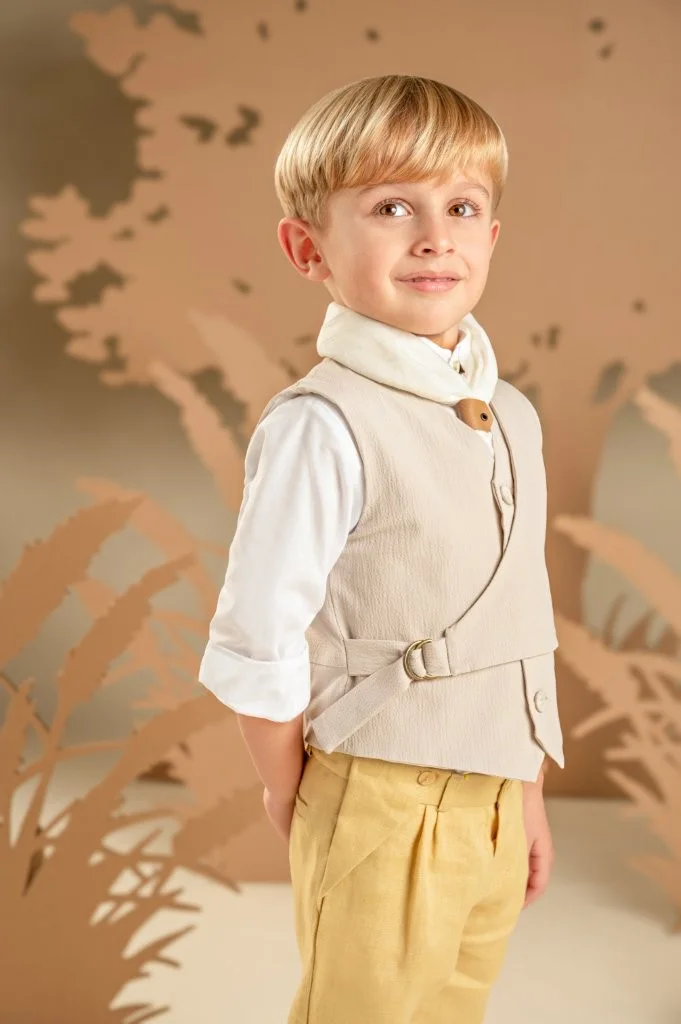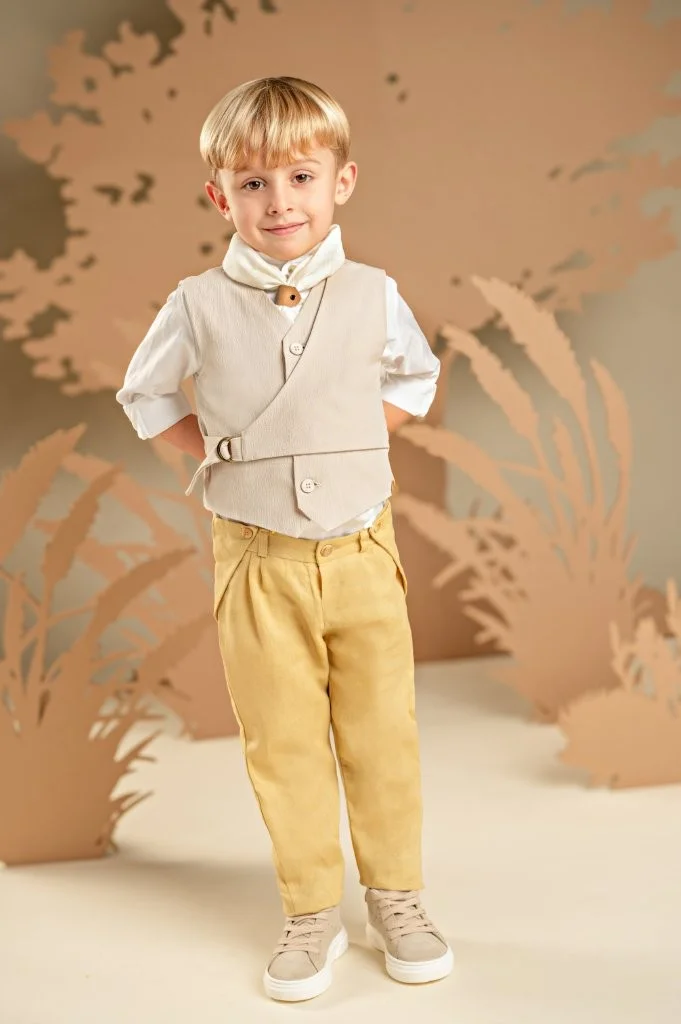 Ένα σετ που συνδυάζει πρωτοτυπία και κομψότητα, ιδανικό για ιδιαίτερες εμφανίσεις. Το λινό παντελόνι σε απόχρωση ginger yellow προσθέτει χρώμα και στυλ, ενώ το διπλό effect γιλέκο με πλαϊνό κλείσιμο, από γκοφρέ βαμβακερό ύφασμα σε μπεζ-γκρι τόνους, ολοκληρώνει όμορφα το σύνολο. Το λευκό βαμβακερό πουκάμισο με Mao γιακά και το τετράγωνο φουλάρι σε λευκό τσαλακωμένο βαμβακερό ύφασμα, προσθέτει μια φρέσκια και μοντέρνα πινελιά. Για το τελικό αποτέλεσμα, επιλέξτε ανάμεσα σε ψάθινο καπέλο ή υφασμάτινη τραγιάσκα, ανάλογα με το προσωπικό σας στυλ.
