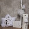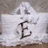 Τσάντα χειροποίητη πλεκτή σε ιβουάρ απόχρωση με μονόγραμμα plexiglass χρυσό ,ασορτί λαμπάδα σε ιβουάρ απόχρωση με χρυσά στοιχεία , σετ λαδιού (3 κεράκια, μπουκαλάκι λαδιού, σαπουνάκι) .
