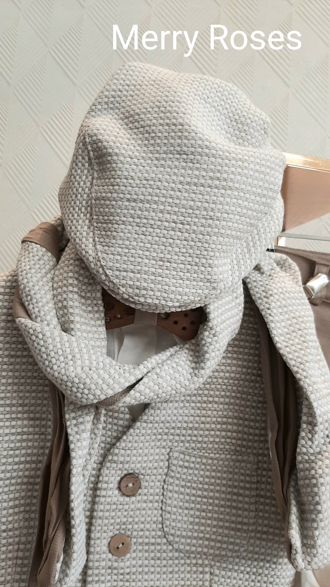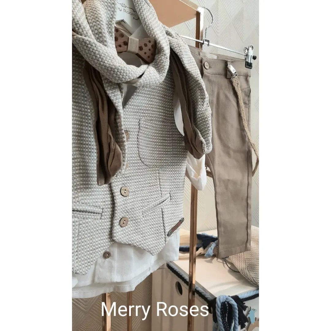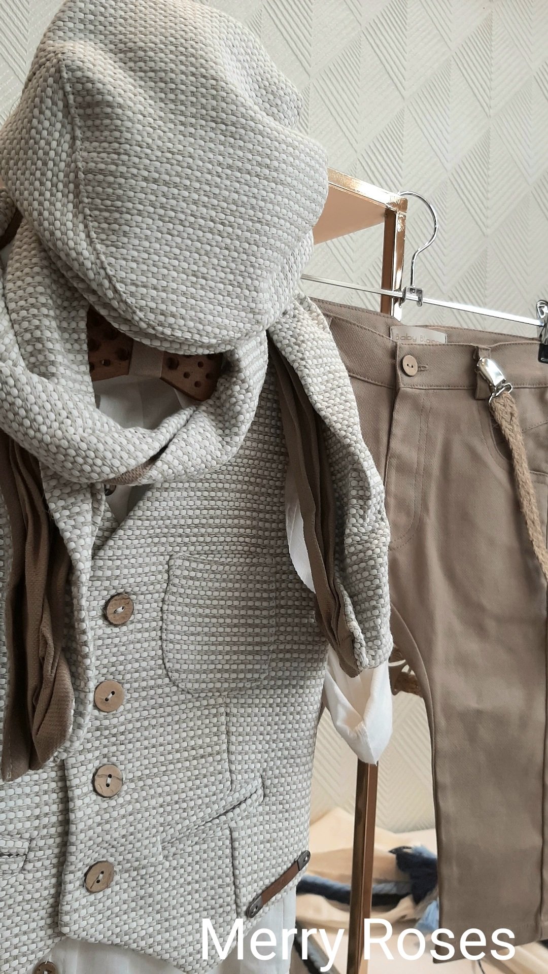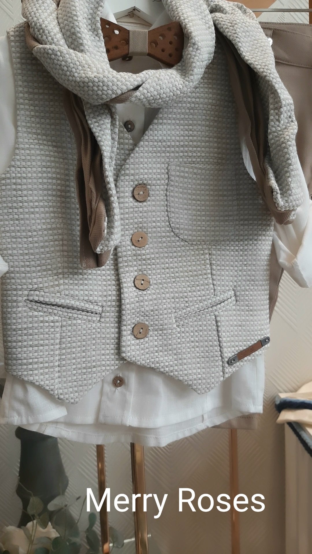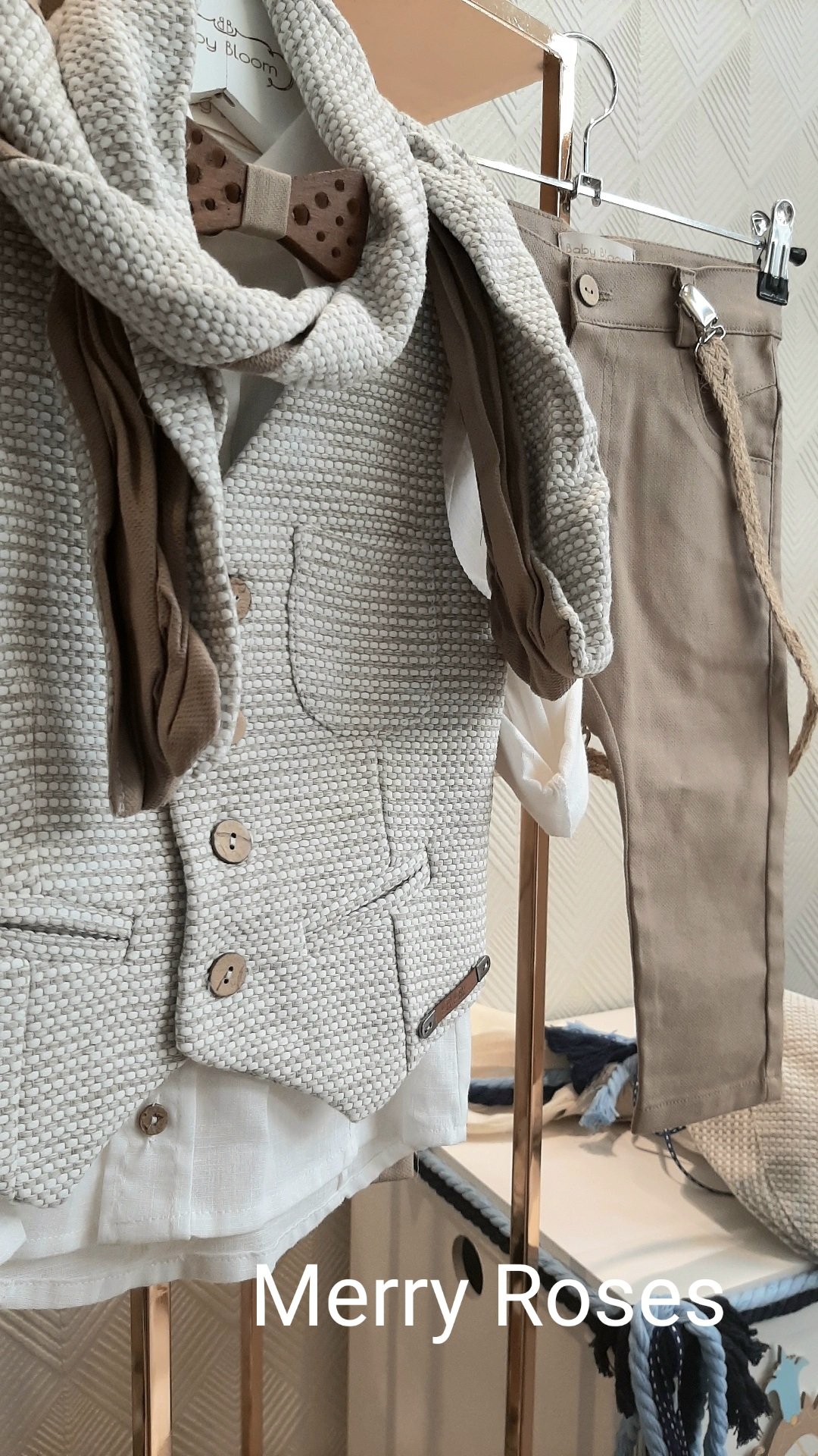 Σετ 7 τμχ με παντελόνι,πουκάμισο,γιλέκο, τιράντες, ξύλινο παπιγιόν, δίχρωμο φουλάρι και ψάθινο καπέλο ή μπερές.