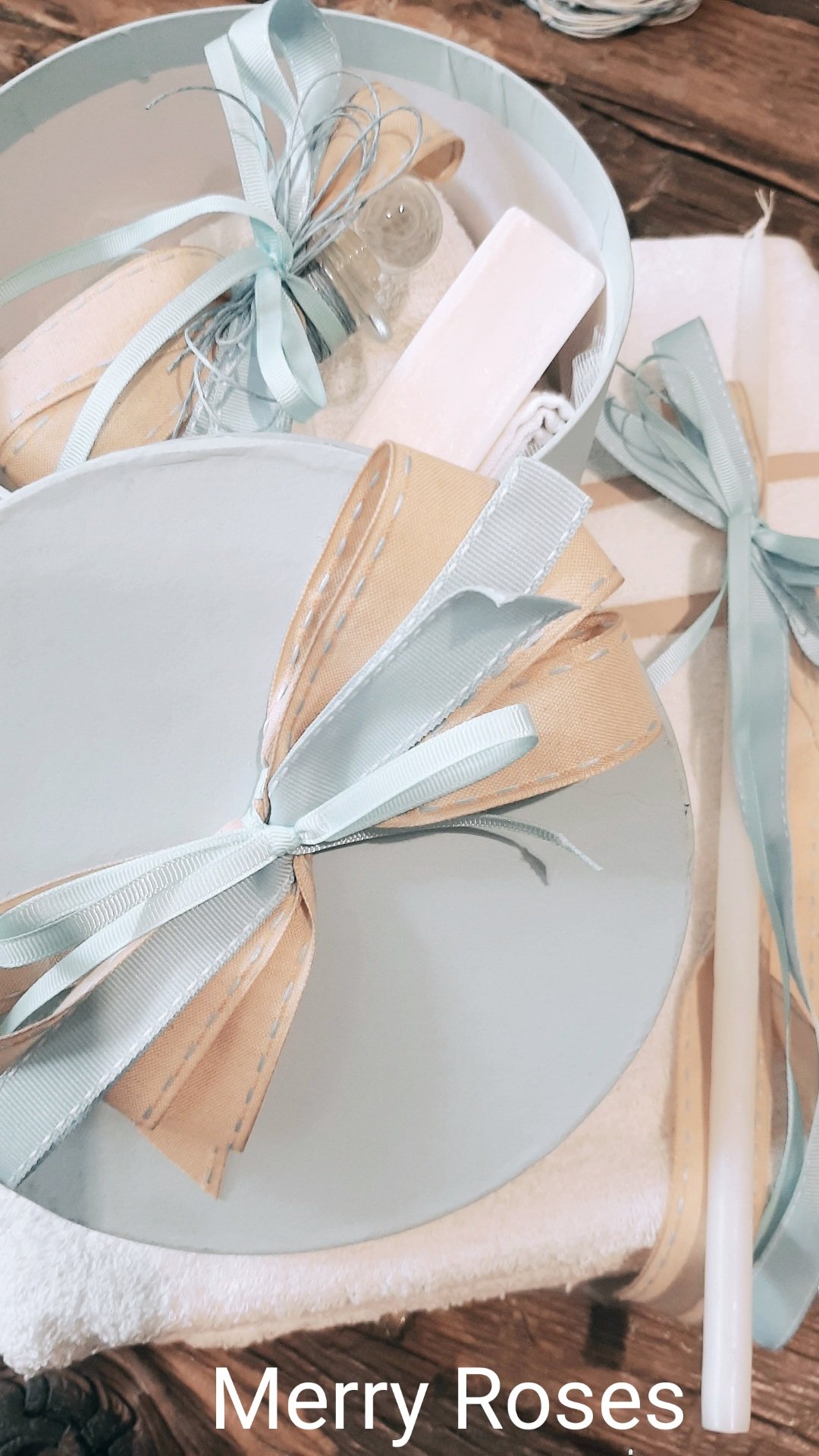 Σας προτείνουμε να συνδυάσετε κουτί στολισμένο, λαμπάδα, λαδόπανα, εσώρουχα, πετσέτες και σετ κολυμπήθρας (κεράκια-σαπούνι-μπουκάλι λαδιού) στις ίδιες αποχρώσεις του ρούχου.