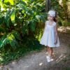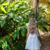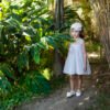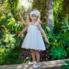 Ένα εντυπωσιακό φόρεμα βάπτισης Baby Bloom από ιδιαίτερο αραχνοΰφαντο ύφασμα με μανίκι από μια ιδιαίτερη ανάγλυφη δανδέλα και χειροποίητο λουλούδι το οποίο στολίζει την μέση του φορέματος , στο πίσω μέρος του μια φανταστική πλάτη με Χ δέσιμο και μεγάλο φιόγκο στο τελείωμα.