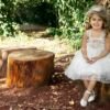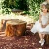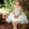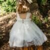 Ρομαντικό φόρεμα βάπτισης σε λευκή απόχρωση με ιδιαίτερη ανάγλυφη δανδέλα και χειροποίητο λουλούδι που στολίζει τη μέση του φορέματος . τούλινη φούστα με κεντημένα λουλουδάκια και εσωτερική επένδυση από μαλακό βαμβακερό ύφασμα . Ασορτί κορδέλα με το ίδιο λουλούδι του φορέματος και κατ’ επιλογή μπαντάνα ή τουρμπάνι .