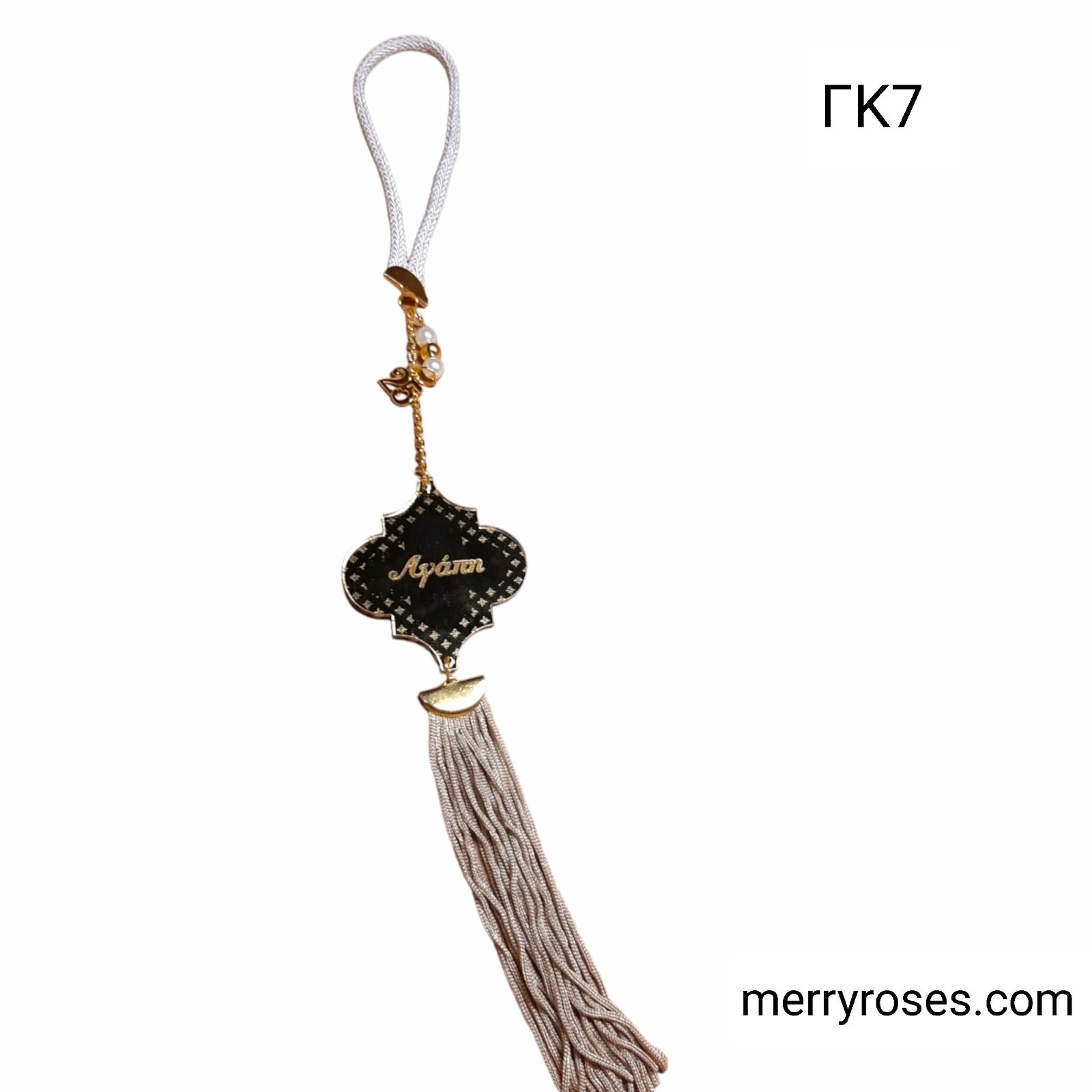 Κρεμαστό γούρι αγάπη (χρυσό plexi),με φούντα μπεζ και κόσμημα.