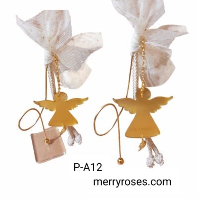 Γούρι αγγελάκι με ευχή ευτυχία, σε βάση γυάλινη, μαζί με μέταλλο μπρούντζου.