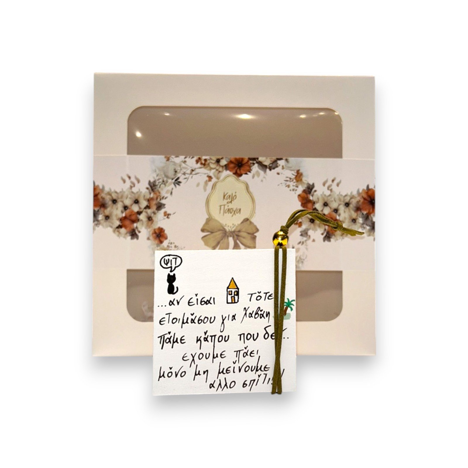 Συσκευασία: Κουτί δώρου με floral σχέδιο, παράθυρα προβολής και επιγραφή “Καλό Πάσχα”