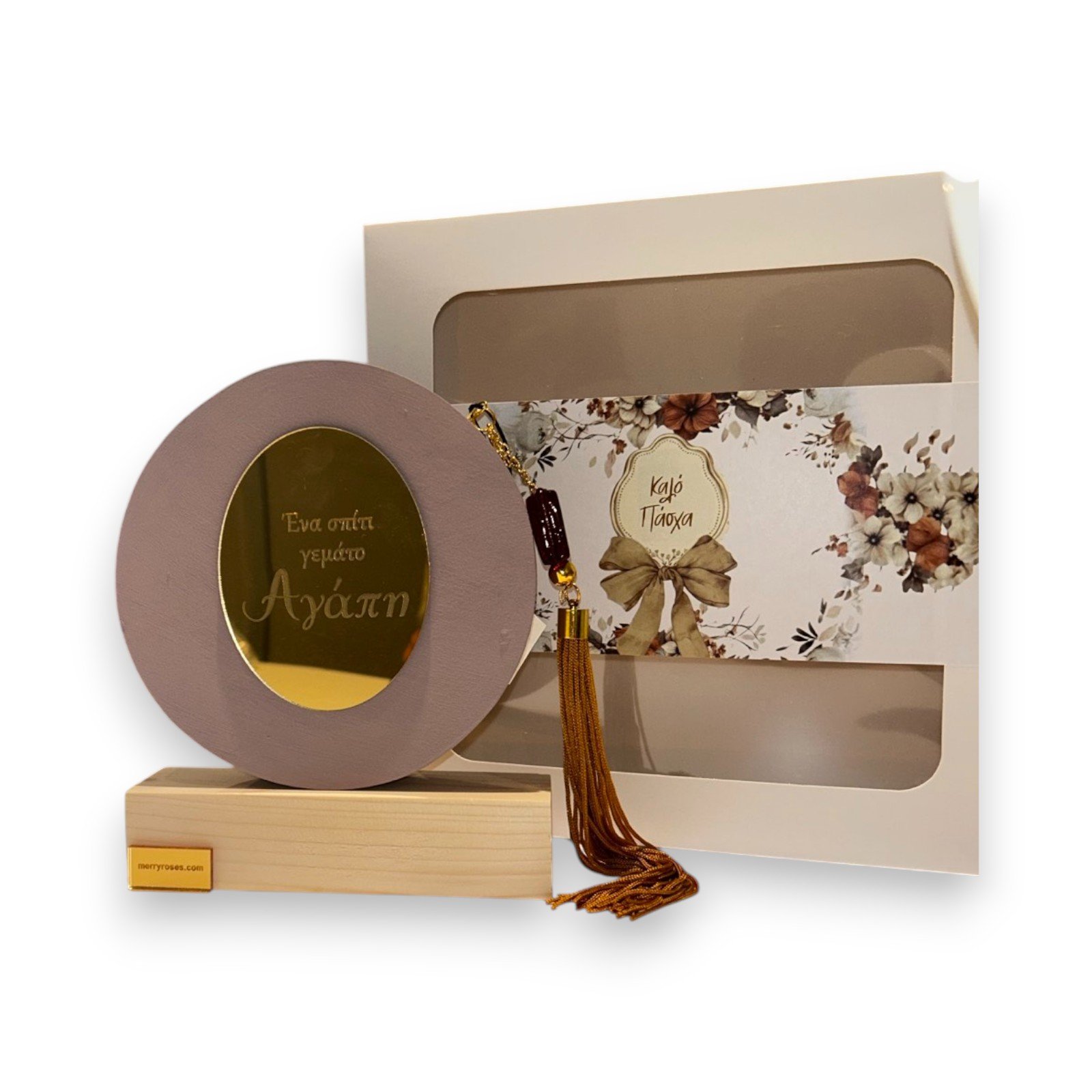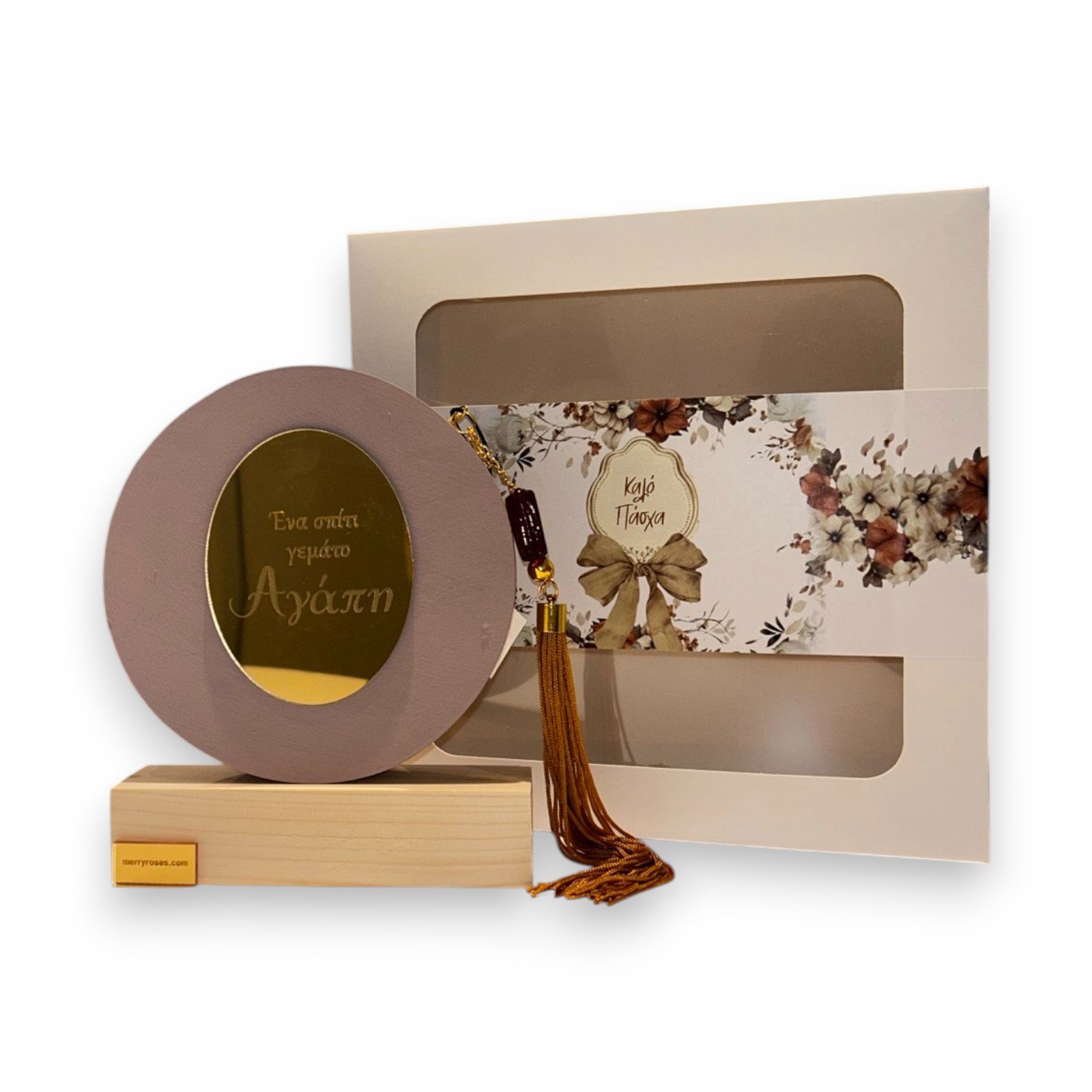 – Συσκευασία: Κουτί δώρου με floral σχέδιο, παράθυρα προβολής και επιγραφή “Καλό Πάσχα”