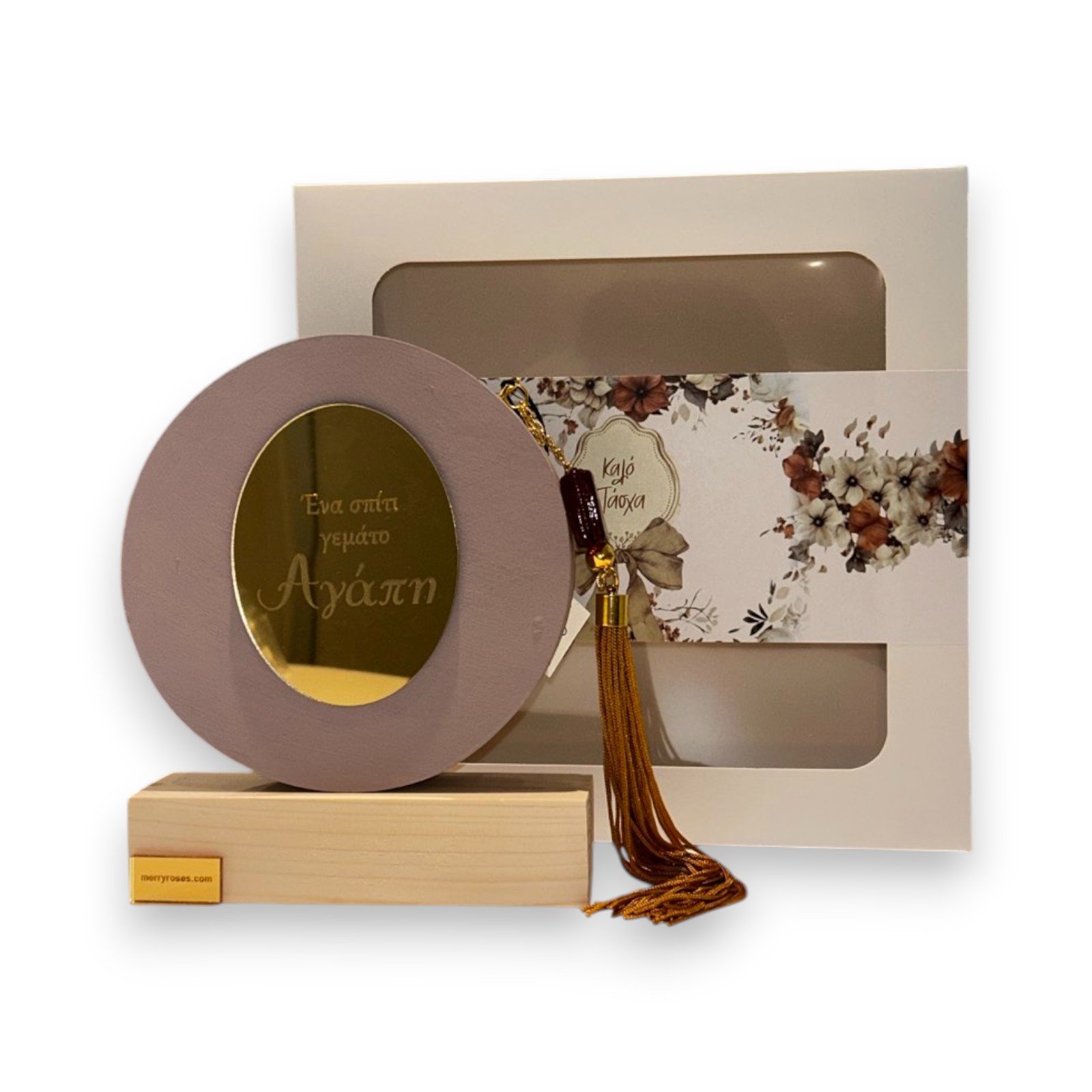 – Σχέδιο: χαραγμένη επιγραφή “Ένα Σπίτι γεμάτο Αγάπη” σε χρυσό