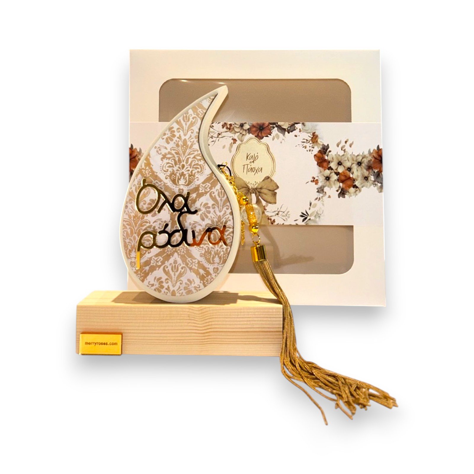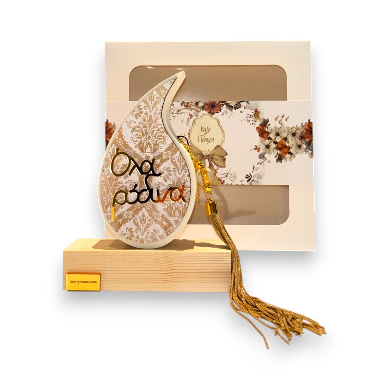 Συσκευασία: Κουτί δώρου με floral σχέδιο, παράθυρα προβολής και επιγραφή “Καλό Πάσχα”