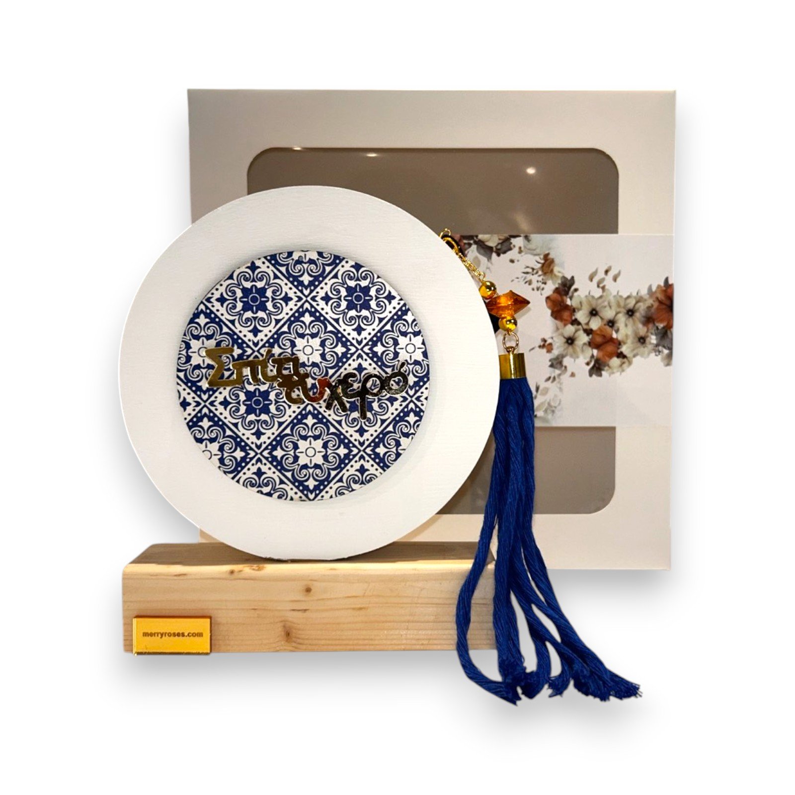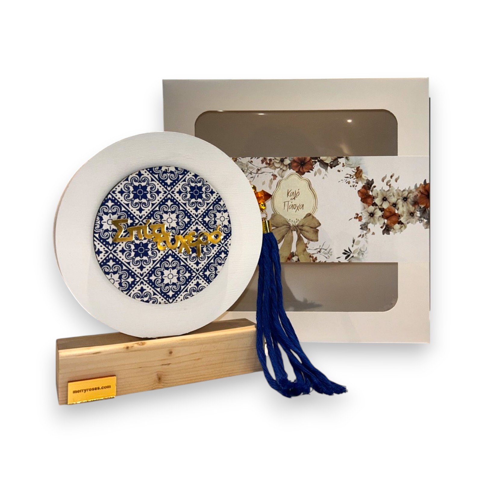 – Σχέδιο: Παραδοσιακό πορτογαλικό azulejo pattern με χαραγμένη επιγραφή “Σπίτι Τυχερό” σε χρυσό