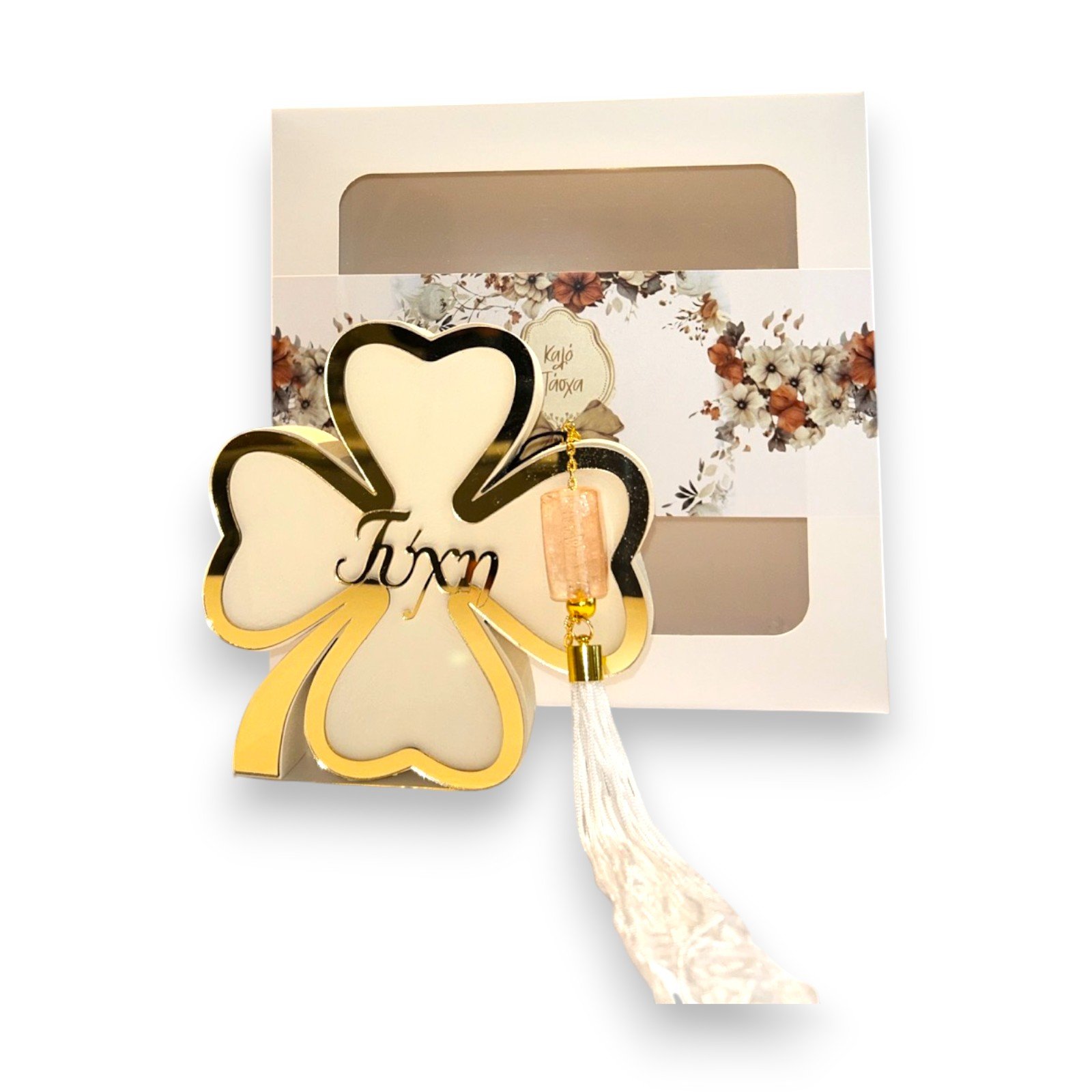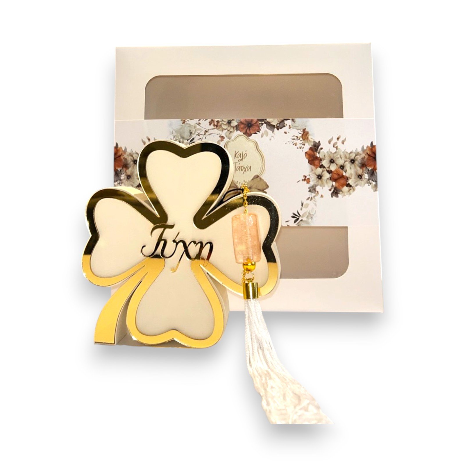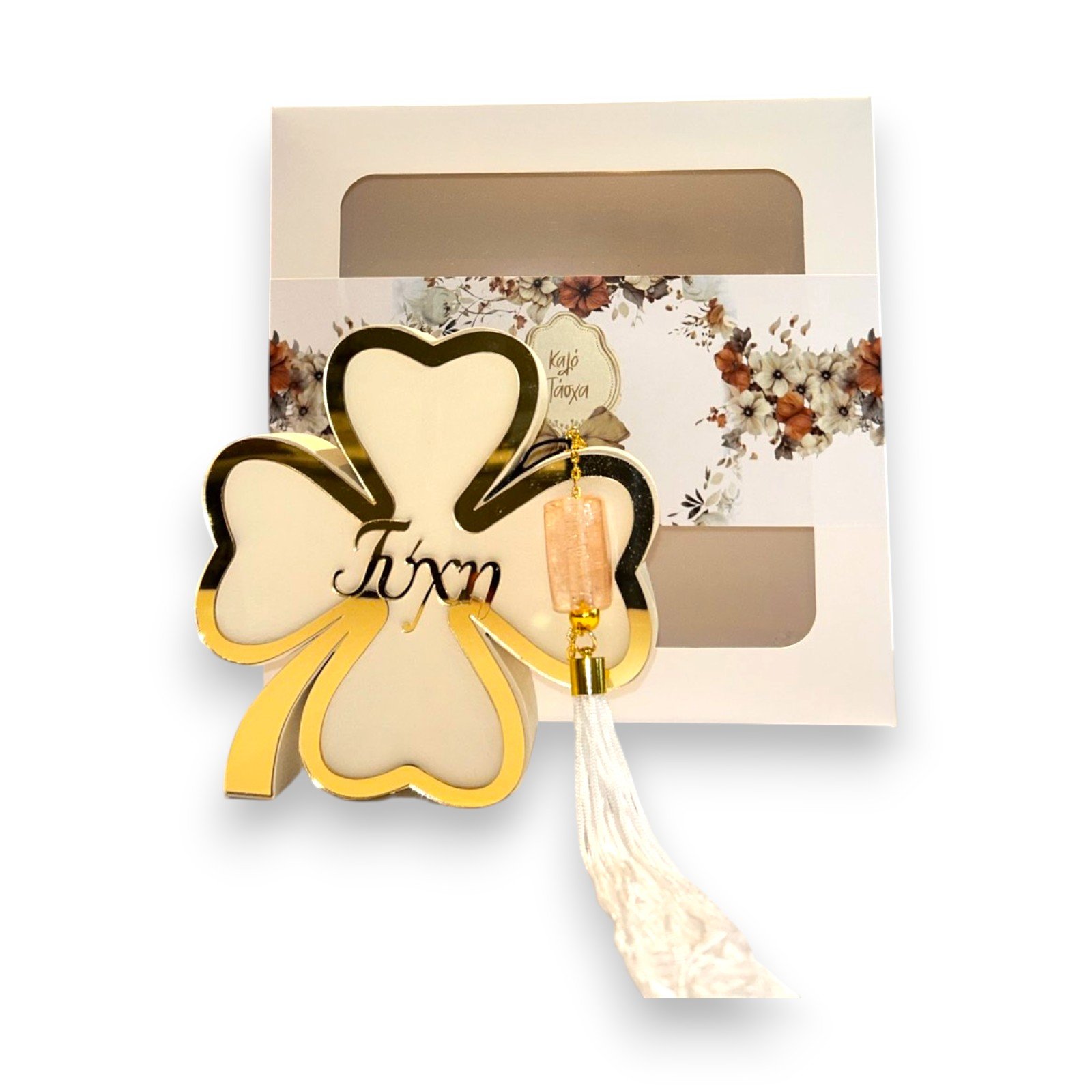 – Σχέδιο: Τριφύλλι (σύμβολο τύχης) με κεντρική χαραγμένη επιγραφή “Τύχη”